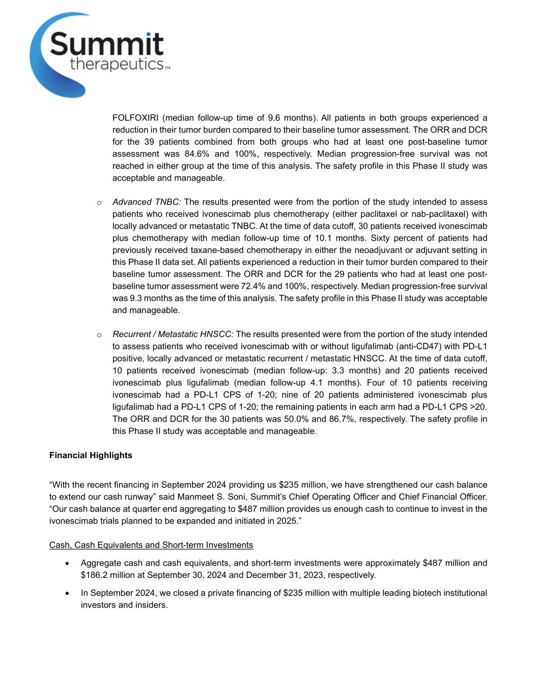 FOLFOXIRI (median follow-up time of 9.6 months). All patients in both groups experienced a reduction in their tumor burden compared to their baseline tumor assessment. The ORR and DCR for the 39 patients combined from both groups who had at least one post-baseline tumor assessment was 84.6% and 100%, respectively. Median progression-free survival was not reached in either group at the time of this analysis. The safety profile in this Phase II study was acceptable and manageable. o Advanced TNBC: The results presented were from the portion of the study intended to assess patients who received ivonescimab plus chemotherapy (either paclitaxel or nab-paclitaxel) with locally advanced or metastatic TNBC. At the time of data cutoff, 30 patients received ivonescimab plus chemotherapy with median follow-up time of 10.1 months. Sixty percent of patients had previously received taxane-based chemotherapy in either the neoadjuvant or adjuvant setting in this Phase II data set. All patients experienced a reduction in their tumor burden compared to their baseline tumor assessment. The ORR and DCR for the 29 patients who had at least one post- baseline tumor assessment were 72.4% and 100%, respectively. Median progression-free survival was 9.3 months as the time of this analysis. The safety profile in this Phase II study was acceptable and manageable. o Recurrent / Metastatic HNSCC: The results presented were from the portion of the study intended to assess patients who received ivonescimab with or without ligufalimab (anti-CD47) with PD-L1 positive, locally advanced or metastatic recurrent / metastatic HNSCC. At the time of data cutoff, 10 patients received ivonescimab (median follow-up: 3.3 months) and 20 patients received ivonescimab plus ligufalimab (median follow-up 4.1 months). Four of 10 patients receiving ivonescimab had a PD-L1 CPS of 1-20; nine of 20 patients administered ivonescimab plus ligufalimab had a PD-L1 CPS of 1-20; the remaining patients in each arm had a PD-L1 CPS >20. The ORR and DCR for the 30 patients was 50.0% and 86.7%, respectively. The safety profile in this Phase II study was acceptable and manageable. Financial Highlights “With the recent financing in September 2024 providing us $235 million, we have strengthened our cash balance to extend our cash runway” said Manmeet S. Soni, Summit’s Chief Operating Officer and Chief Financial Officer. “Our cash balance at quarter end aggregating to $487 million provides us enough cash to continue to invest in the ivonescimab trials planned to be expanded and initiated in 2025.” Cash, Cash Equivalents and Short-term Investments  Aggregate cash and cash equivalents, and short-term investments were approximately $487 million and $186.2 million at September 30, 2024 and December 31, 2023, respectively.  In September 2024, we closed a private financing of $235 million with multiple leading biotech institutional investors and insiders.