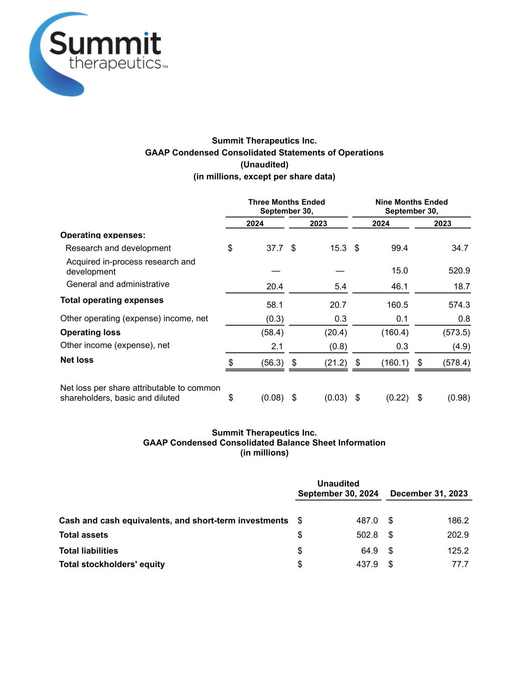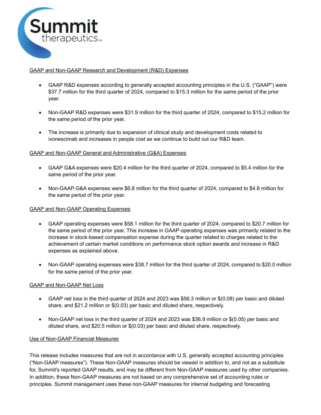 GAAP and Non-GAAP Research and Development (R&D) Expenses  GAAP R&D expenses according to generally accepted accounting principles in the U.S. (“GAAP”) were $37.7 million for the third quarter of 2024, compared to $15.3 million for the same period of the prior year.  Non-GAAP R&D expenses were $31.9 million for the third quarter of 2024, compared to $15.2 million for the same period of the prior year.  The increase is primarily due to expansion of clinical study and development costs related to ivonescimab and increases in people cost as we continue to build out our R&D team. GAAP and Non-GAAP General and Administrative (G&A) Expenses  GAAP G&A expenses were $20.4 million for the third quarter of 2024, compared to $5.4 million for the same period of the prior year.  Non-GAAP G&A expenses were $6.8 million for the third quarter of 2024, compared to $4.8 million for the same period of the prior year. GAAP and Non-GAAP Operating Expenses  GAAP operating expenses were $58.1 million for the third quarter of 2024, compared to $20.7 million for the same period of the prior year. This increase in GAAP operating expenses was primarily related to the increase in stock-based compensation expense during the quarter related to charges related to the achievement of certain market conditions on performance stock option awards and increase in R&D expenses as explained above.  Non-GAAP operating expenses were $38.7 million for the third quarter of 2024, compared to $20.0 million for the same period of the prior year. GAAP and Non-GAAP Net Loss  GAAP net loss in the third quarter of 2024 and 2023 was $56.3 million or $(0.08) per basic and diluted share, and $21.2 million or $(0.03) per basic and diluted share, respectively.  Non-GAAP net loss in the third quarter of 2024 and 2023 was $36.9 million or $(0.05) per basic and diluted share, and $20.5 million or $(0.03) per basic and diluted share, respectively. Use of Non-GAAP Financial Measures This release includes measures that are not in accordance with U.S. generally accepted accounting principles (“Non-GAAP measures”). These Non-GAAP measures should be viewed in addition to, and not as a substitute for, Summit's reported GAAP results, and may be different from Non-GAAP measures used by other companies. In addition, these Non-GAAP measures are not based on any comprehensive set of accounting rules or principles. Summit management uses these non-GAAP measures for internal budgeting and forecasting