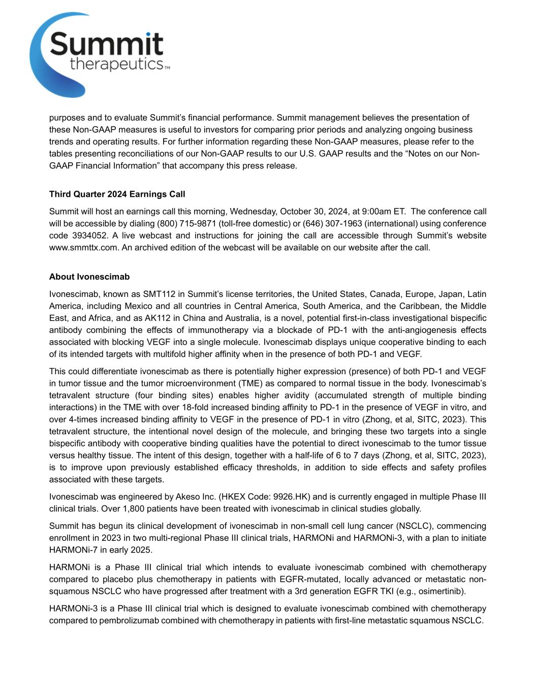 purposes and to evaluate Summit’s financial performance. Summit management believes the presentation of these Non-GAAP measures is useful to investors for comparing prior periods and analyzing ongoing business trends and operating results. For further information regarding these Non-GAAP measures, please refer to the tables presenting reconciliations of our Non-GAAP results to our U.S. GAAP results and the “Notes on our Non- GAAP Financial Information” that accompany this press release. Third Quarter 2024 Earnings Call Summit will host an earnings call this morning, Wednesday, October 30, 2024, at 9:00am ET. The conference call will be accessible by dialing (800) 715-9871 (toll-free domestic) or (646) 307-1963 (international) using conference code 3934052. A live webcast and instructions for joining the call are accessible through Summit’s website www.smmttx.com. An archived edition of the webcast will be available on our website after the call. About Ivonescimab Ivonescimab, known as SMT112 in Summit’s license territories, the United States, Canada, Europe, Japan, Latin America, including Mexico and all countries in Central America, South America, and the Caribbean, the Middle East, and Africa, and as AK112 in China and Australia, is a novel, potential first-in-class investigational bispecific antibody combining the effects of immunotherapy via a blockade of PD-1 with the anti-angiogenesis effects associated with blocking VEGF into a single molecule. Ivonescimab displays unique cooperative binding to each of its intended targets with multifold higher affinity when in the presence of both PD-1 and VEGF. This could differentiate ivonescimab as there is potentially higher expression (presence) of both PD-1 and VEGF in tumor tissue and the tumor microenvironment (TME) as compared to normal tissue in the body. Ivonescimab’s tetravalent structure (four binding sites) enables higher avidity (accumulated strength of multiple binding interactions) in the TME with over 18-fold increased binding affinity to PD-1 in the presence of VEGF in vitro, and over 4-times increased binding affinity to VEGF in the presence of PD-1 in vitro (Zhong, et al, SITC, 2023). This tetravalent structure, the intentional novel design of the molecule, and bringing these two targets into a single bispecific antibody with cooperative binding qualities have the potential to direct ivonescimab to the tumor tissue versus healthy tissue. The intent of this design, together with a half-life of 6 to 7 days (Zhong, et al, SITC, 2023), is to improve upon previously established efficacy thresholds, in addition to side effects and safety profiles associated with these targets. Ivonescimab was engineered by Akeso Inc. (HKEX Code: 9926.HK) and is currently engaged in multiple Phase III clinical trials. Over 1,800 patients have been treated with ivonescimab in clinical studies globally. Summit has begun its clinical development of ivonescimab in non-small cell lung cancer (NSCLC), commencing enrollment in 2023 in two multi-regional Phase III clinical trials, HARMONi and HARMONi-3, with a plan to initiate HARMONi-7 in early 2025. HARMONi is a Phase III clinical trial which intends to evaluate ivonescimab combined with chemotherapy compared to placebo plus chemotherapy in patients with EGFR-mutated, locally advanced or metastatic non- squamous NSCLC who have progressed after treatment with a 3rd generation EGFR TKI (e.g., osimertinib). HARMONi-3 is a Phase III clinical trial which is designed to evaluate ivonescimab combined with chemotherapy compared to pembrolizumab combined with chemotherapy in patients with first-line metastatic squamous NSCLC.