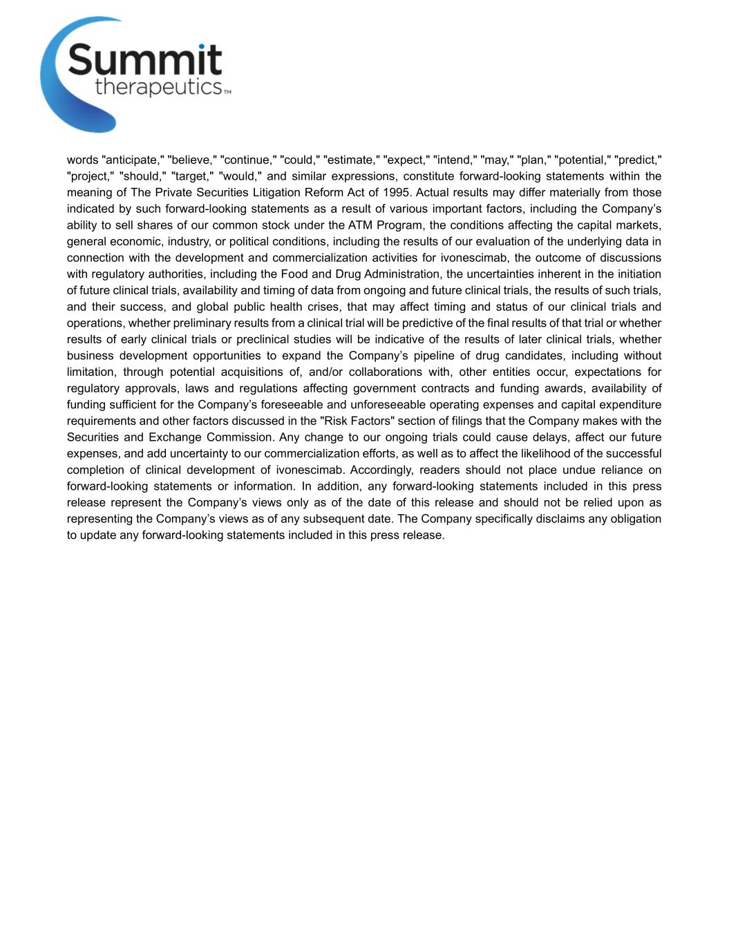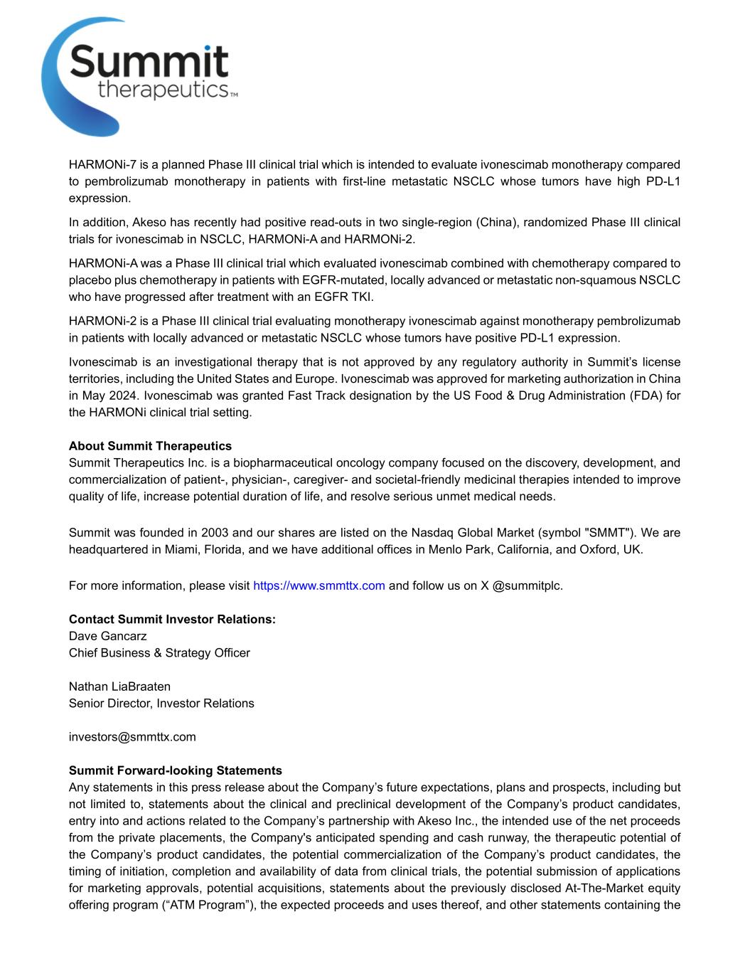 HARMONi-7 is a planned Phase III clinical trial which is intended to evaluate ivonescimab monotherapy compared to pembrolizumab monotherapy in patients with first-line metastatic NSCLC whose tumors have high PD-L1 expression. In addition, Akeso has recently had positive read-outs in two single-region (China), randomized Phase III clinical trials for ivonescimab in NSCLC, HARMONi-A and HARMONi-2. HARMONi-A was a Phase III clinical trial which evaluated ivonescimab combined with chemotherapy compared to placebo plus chemotherapy in patients with EGFR-mutated, locally advanced or metastatic non-squamous NSCLC who have progressed after treatment with an EGFR TKI. HARMONi-2 is a Phase III clinical trial evaluating monotherapy ivonescimab against monotherapy pembrolizumab in patients with locally advanced or metastatic NSCLC whose tumors have positive PD-L1 expression. Ivonescimab is an investigational therapy that is not approved by any regulatory authority in Summit’s license territories, including the United States and Europe. Ivonescimab was approved for marketing authorization in China in May 2024. Ivonescimab was granted Fast Track designation by the US Food & Drug Administration (FDA) for the HARMONi clinical trial setting. About Summit Therapeutics Summit Therapeutics Inc. is a biopharmaceutical oncology company focused on the discovery, development, and commercialization of patient-, physician-, caregiver- and societal-friendly medicinal therapies intended to improve quality of life, increase potential duration of life, and resolve serious unmet medical needs. Summit was founded in 2003 and our shares are listed on the Nasdaq Global Market (symbol "SMMT"). We are headquartered in Miami, Florida, and we have additional offices in Menlo Park, California, and Oxford, UK. For more information, please visit https://www.smmttx.com and follow us on X @summitplc. Contact Summit Investor Relations: Dave Gancarz Chief Business & Strategy Officer Nathan LiaBraaten Senior Director, Investor Relations investors@smmttx.com Summit Forward-looking Statements Any statements in this press release about the Company’s future expectations, plans and prospects, including but not limited to, statements about the clinical and preclinical development of the Company’s product candidates, entry into and actions related to the Company’s partnership with Akeso Inc., the intended use of the net proceeds from the private placements, the Company's anticipated spending and cash runway, the therapeutic potential of the Company’s product candidates, the potential commercialization of the Company’s product candidates, the timing of initiation, completion and availability of data from clinical trials, the potential submission of applications for marketing approvals, potential acquisitions, statements about the previously disclosed At-The-Market equity offering program (“ATM Program”), the expected proceeds and uses thereof, and other statements containing the