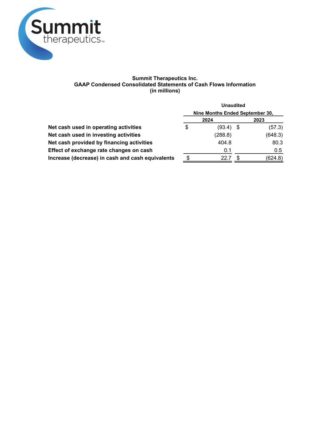 Summit Therapeutics Inc. GAAP Condensed Consolidated Statements of Cash Flows Information (in millions) Unaudited Nine Months Ended September 30, 2024 2023 Net cash used in operating activities $ (93.4) $ (57.3) Net cash used in investing activities (288.8) (648.3) Net cash provided by financing activities 404.8 80.3 Effect of exchange rate changes on cash 0.1 0.5 Increase (decrease) in cash and cash equivalents $ 22.7 $ (624.8)