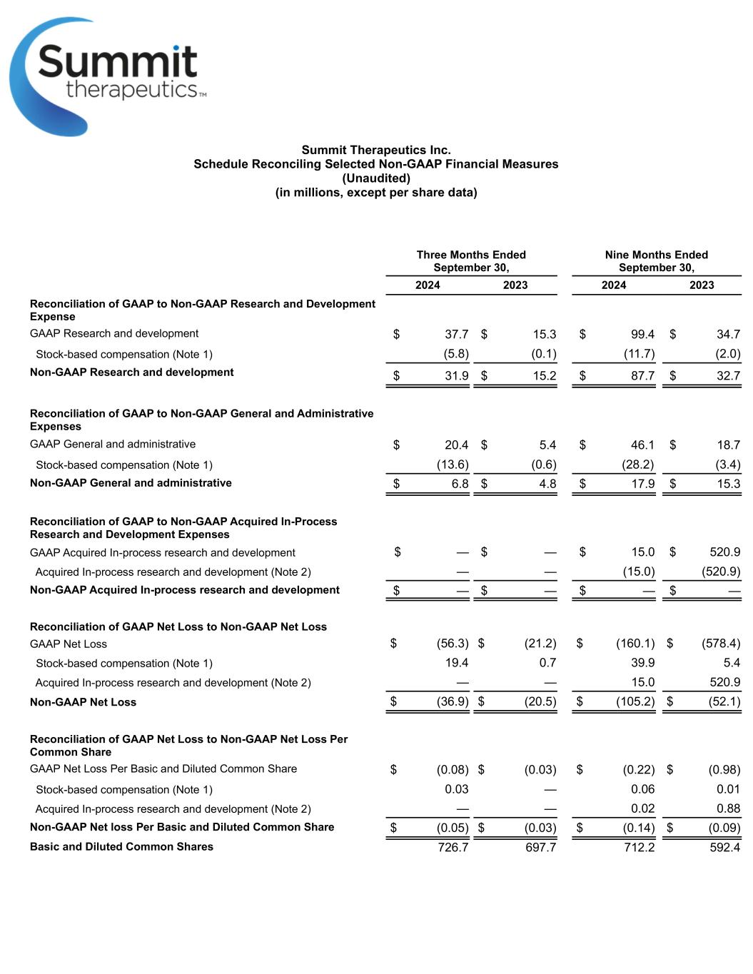 Summit Therapeutics Inc. Schedule Reconciling Selected Non-GAAP Financial Measures (Unaudited) (in millions, except per share data) Three Months Ended September 30, Nine Months Ended September 30, 2024 2023 2024 2023 Reconciliation of GAAP to Non-GAAP Research and Development Expense GAAP Research and development $ 37.7 $ 15.3 $ 99.4 $ 34.7 Stock-based compensation (Note 1) (5.8) (0.1) (11.7) (2.0) Non-GAAP Research and development $ 31.9 $ 15.2 $ 87.7 $ 32.7 Reconciliation of GAAP to Non-GAAP General and Administrative Expenses GAAP General and administrative $ 20.4 $ 5.4 $ 46.1 $ 18.7 Stock-based compensation (Note 1) (13.6) (0.6) (28.2) (3.4) Non-GAAP General and administrative $ 6.8 $ 4.8 $ 17.9 $ 15.3 Reconciliation of GAAP to Non-GAAP Acquired In-Process Research and Development Expenses GAAP Acquired In-process research and development $ — $ — $ 15.0 $ 520.9 Acquired In-process research and development (Note 2) — — (15.0) (520.9) Non-GAAP Acquired In-process research and development $ — $ — $ — $ — Reconciliation of GAAP Net Loss to Non-GAAP Net Loss GAAP Net Loss $ (56.3) $ (21.2) $ (160.1) $ (578.4) Stock-based compensation (Note 1) 19.4 0.7 39.9 5.4 Acquired In-process research and development (Note 2) — — 15.0 520.9 Non-GAAP Net Loss $ (36.9) $ (20.5) $ (105.2) $ (52.1) Reconciliation of GAAP Net Loss to Non-GAAP Net Loss Per Common Share GAAP Net Loss Per Basic and Diluted Common Share $ (0.08) $ (0.03) $ (0.22) $ (0.98) Stock-based compensation (Note 1) 0.03 — 0.06 0.01 Acquired In-process research and development (Note 2) — — 0.02 0.88 Non-GAAP Net loss Per Basic and Diluted Common Share $ (0.05) $ (0.03) $ (0.14) $ (0.09) Basic and Diluted Common Shares 726.7 697.7 712.2 592.4