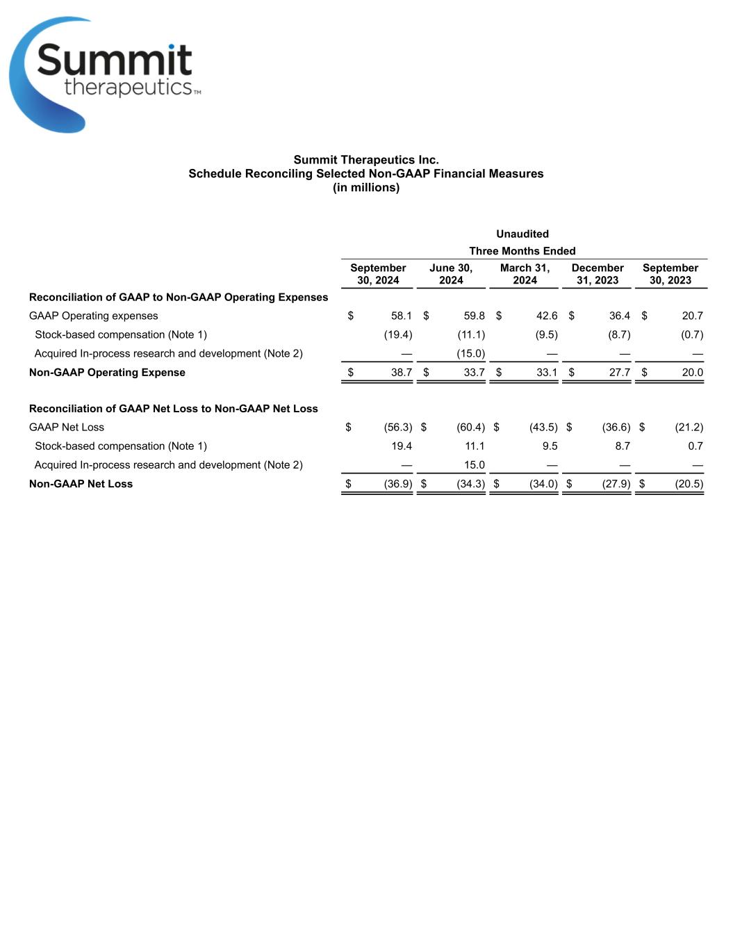 Summit Therapeutics Inc. Schedule Reconciling Selected Non-GAAP Financial Measures (in millions) Unaudited Three Months Ended September 30, 2024 June 30, 2024 March 31, 2024 December 31, 2023 September 30, 2023 Reconciliation of GAAP to Non-GAAP Operating Expenses GAAP Operating expenses $ 58.1 $ 59.8 $ 42.6 $ 36.4 $ 20.7 Stock-based compensation (Note 1) (19.4) (11.1) (9.5) — (8.7) — (0.7) Acquired In-process research and development (Note 2) — (15.0) — — — Non-GAAP Operating Expense $ 38.7 $ 33.7 $ 33.1 $ 27.7 $ 20.0 Reconciliation of GAAP Net Loss to Non-GAAP Net Loss GAAP Net Loss $ (56.3) $ (60.4) $ (43.5) $ (36.6) $ (21.2) Stock-based compensation (Note 1) 19.4 11.1 9.5 8.7 0.7 Acquired In-process research and development (Note 2) — 15.0 — — — Non-GAAP Net Loss $ (36.9) $ (34.3) $ (34.0) $ (27.9) $ (20.5)