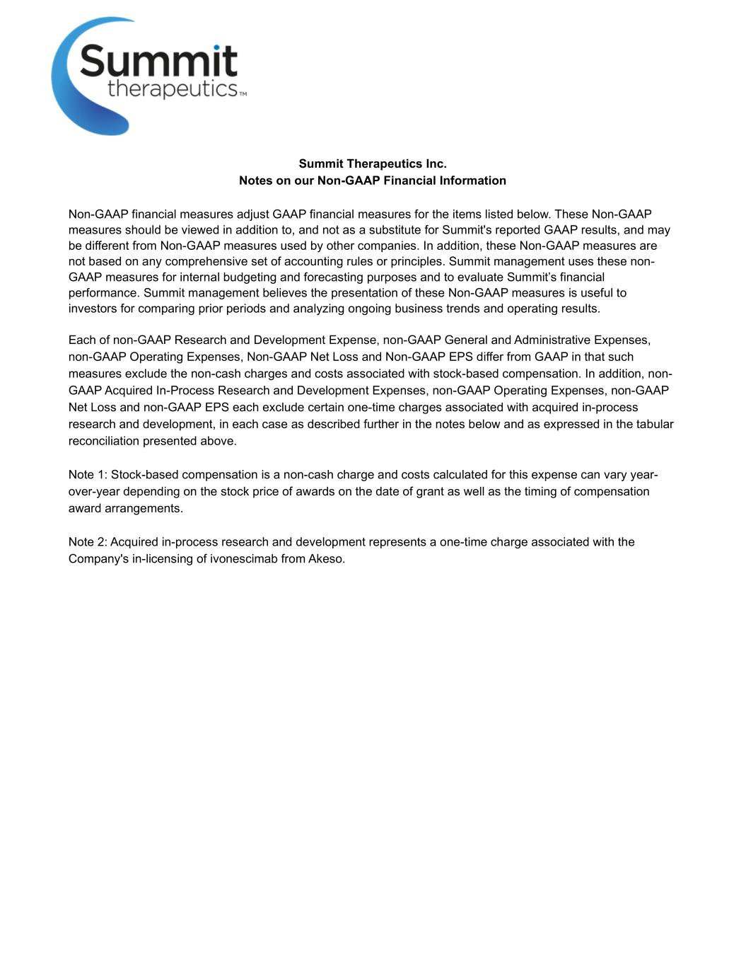 Summit Therapeutics Inc. Notes on our Non-GAAP Financial Information Non-GAAP financial measures adjust GAAP financial measures for the items listed below. These Non-GAAP measures should be viewed in addition to, and not as a substitute for Summit's reported GAAP results, and may be different from Non-GAAP measures used by other companies. In addition, these Non-GAAP measures are not based on any comprehensive set of accounting rules or principles. Summit management uses these non- GAAP measures for internal budgeting and forecasting purposes and to evaluate Summit’s financial performance. Summit management believes the presentation of these Non-GAAP measures is useful to investors for comparing prior periods and analyzing ongoing business trends and operating results. Each of non-GAAP Research and Development Expense, non-GAAP General and Administrative Expenses, non-GAAP Operating Expenses, Non-GAAP Net Loss and Non-GAAP EPS differ from GAAP in that such measures exclude the non-cash charges and costs associated with stock-based compensation. In addition, non- GAAP Acquired In-Process Research and Development Expenses, non-GAAP Operating Expenses, non-GAAP Net Loss and non-GAAP EPS each exclude certain one-time charges associated with acquired in-process research and development, in each case as described further in the notes below and as expressed in the tabular reconciliation presented above. Note 1: Stock-based compensation is a non-cash charge and costs calculated for this expense can vary year- over-year depending on the stock price of awards on the date of grant as well as the timing of compensation award arrangements. Note 2: Acquired in-process research and development represents a one-time charge associated with the Company's in-licensing of ivonescimab from Akeso.