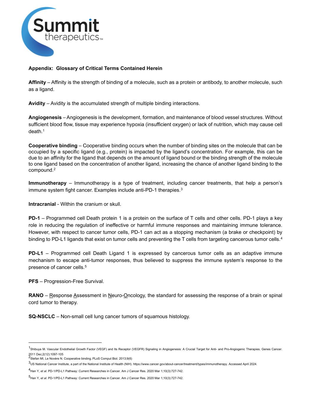 Appendix: Glossary of Critical Terms Contained Herein Affinity – Affinity is the strength of binding of a molecule, such as a protein or antibody, to another molecule, such as a ligand. Avidity – Avidity is the accumulated strength of multiple binding interactions. Angiogenesis – Angiogenesis is the development, formation, and maintenance of blood vessel structures. Without sufficient blood flow, tissue may experience hypoxia (insufficient oxygen) or lack of nutrition, which may cause cell death.1 Cooperative binding – Cooperative binding occurs when the number of binding sites on the molecule that can be occupied by a specific ligand (e.g., protein) is impacted by the ligand’s concentration. For example, this can be due to an affinity for the ligand that depends on the amount of ligand bound or the binding strength of the molecule to one ligand based on the concentration of another ligand, increasing the chance of another ligand binding to the compound.2 Immunotherapy – Immunotherapy is a type of treatment, including cancer treatments, that help a person’s immune system fight cancer. Examples include anti-PD-1 therapies.3 Intracranial - Within the cranium or skull. PD-1 – Programmed cell Death protein 1 is a protein on the surface of T cells and other cells. PD-1 plays a key role in reducing the regulation of ineffective or harmful immune responses and maintaining immune tolerance. However, with respect to cancer tumor cells, PD-1 can act as a stopping mechanism (a brake or checkpoint) by binding to PD-L1 ligands that exist on tumor cells and preventing the T cells from targeting cancerous tumor cells.4 PD-L1 – Programmed cell Death Ligand 1 is expressed by cancerous tumor cells as an adaptive immune mechanism to escape anti-tumor responses, thus believed to suppress the immune system’s response to the presence of cancer cells.5 PFS – Progression-Free Survival. RANO – Response Assessment in Neuro-Oncology, the standard for assessing the response of a brain or spinal cord tumor to therapy. SQ-NSCLC – Non-small cell lung cancer tumors of squamous histology. 1Shibuya M. Vascular Endothelial Growth Factor (VEGF) and Its Receptor (VEGFR) Signaling in Angiogenesis: A Crucial Target for Anti- and Pro-Angiogenic Therapies. Genes Cancer. 2011 Dec;2(12):1097-105 2Stefan MI, Le Novère N. Cooperative binding. PLoS Comput Biol. 2013;9(6) 3US National Cancer Institute, a part of the National Institute of Health (NIH). https://www.cancer.gov/about-cancer/treatment/types/immunotherapy. Accessed April 2024. 4Han Y, et al. PD-1/PD-L1 Pathway: Current Researches in Cancer. Am J Cancer Res. 2020 Mar 1;10(3):727-742. 5Han Y, et al. PD-1/PD-L1 Pathway: Current Researches in Cancer. Am J Cancer Res. 2020 Mar 1;10(3):727-742.