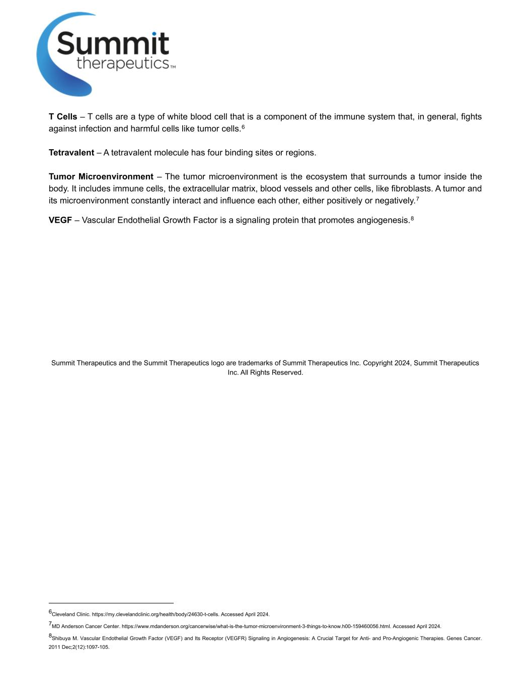 T Cells – T cells are a type of white blood cell that is a component of the immune system that, in general, fights against infection and harmful cells like tumor cells.6 Tetravalent – A tetravalent molecule has four binding sites or regions. Tumor Microenvironment – The tumor microenvironment is the ecosystem that surrounds a tumor inside the body. It includes immune cells, the extracellular matrix, blood vessels and other cells, like fibroblasts. A tumor and its microenvironment constantly interact and influence each other, either positively or negatively.7 VEGF – Vascular Endothelial Growth Factor is a signaling protein that promotes angiogenesis.8 Summit Therapeutics and the Summit Therapeutics logo are trademarks of Summit Therapeutics Inc. Copyright 2024, Summit Therapeutics Inc. All Rights Reserved. 6Cleveland Clinic. https://my.clevelandclinic.org/health/body/24630-t-cells. Accessed April 2024. 7MD Anderson Cancer Center. https://www.mdanderson.org/cancerwise/what-is-the-tumor-microenvironment-3-things-to-know.h00-159460056.html. Accessed April 2024. 8Shibuya M. Vascular Endothelial Growth Factor (VEGF) and Its Receptor (VEGFR) Signaling in Angiogenesis: A Crucial Target for Anti- and Pro-Angiogenic Therapies. Genes Cancer. 2011 Dec;2(12):1097-105.