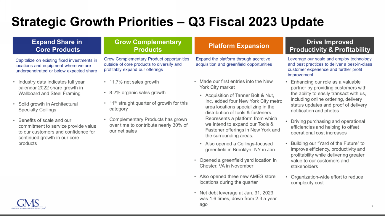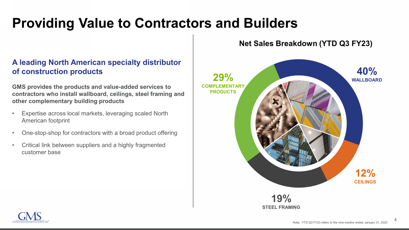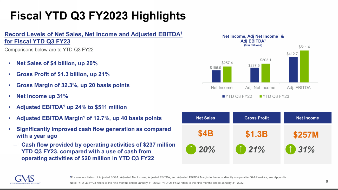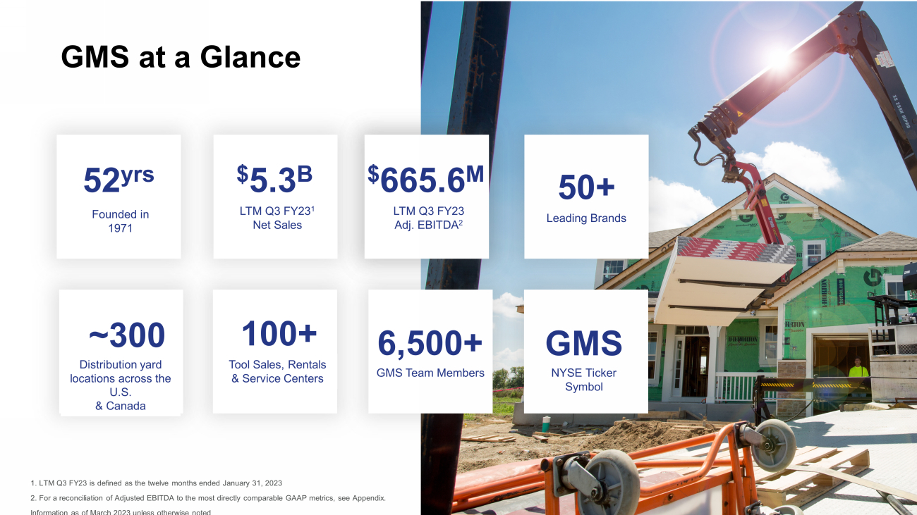 2 Safe Harbor and B asis of Presentation Forward - Looking Statement Safe Harbor — This presentation includes “forward - looking statements” within the meaning of the Private Securities Litigation Reform Act of 1995. You can generally identify forward - looking statements by the Company’s use of forward - looking terminology such as “anticipate,” “bel ieve,” “confident,” “continue,” “could,” “estimate,” “expect,” “intend,” “may,” “might,” “plan,” “potential,” “predict,” “seek,” or “should,” or the negative thereof or other variations th ere on or comparable terminology. In particular, statements about the markets in which GMS operates and our products, including potential growth in those markets and products, the economy general ly, our ability to continue successfully navigating the evolving operating environment and executing our business, strategic initiatives and priorities and growth potential, future M&A and greenfields , product availability, inflation, capital structure, pricing, volumes, net sales, organic sales, gross margins, incremental EBITDA, Adjusted EBITDA, Adjusted EBITDA ma rgi n, interest expense, tax rates, capital expenditures, free cash flow, cash flow generation and working capital management, future financial performance and liquidity, the ability of the Company to grow stronger, the ability to deliver growth, value creation and long - term success, and the Company’s cost reduction initiatives and results thereof contained in this present ation may be considered forward - looking statements. Statements about our expectations, beliefs, plans, strategies, objectives, prospects, assumptions or future events or perform anc e may be considered forward - looking statements. The Company has based forward - looking statements on its current expectations, assumptions, estimates and projections. While the Comp any believes these expectations, assumptions, estimates and projections are reasonable, such forward - looking statements are only predictions and involve known and unknown ris ks and uncertainties, many of which are beyond its control, including current public health issues that may affect the Company’s business. Forward - looking statements involve risks and uncertainties, including, but not limited to, those described in the “Risk Factors” section in the Company’s most recent Annual Report on Form 10 - K, and in its other periodic repor ts filed with the SEC. In addition, the statements in this release are made as of March 6, 2023. The Company undertakes no obligation to update any of the forward - looking statements made herein, whether as a result of new information, future events, changes in expectation or otherwise. These forward - looking statements should not be relied upon as representing t he Company’s views as of any date subsequent to March 6, 2023. Use of Non - GAAP and Adjusted Financial Information — To supplement GAAP financial information, we use adjusted measures of operating results which are non - GAAP measures. This non - GAAP adjusted financial information is provided as additional information for investors. These adjusted results exclude certain costs, expenses, gains and losses, and we believe their exclusion can enhance an overall understanding of our past financial performance and also our prospects for the fu ture. These adjustments to our GAAP results are made with the intent of providing both management and investors a more complete understanding of our operating performance by excl udi ng non - recurring, infrequent or other non - cash charges that are not believed to be material to the ongoing performance of our business. The presentation of this additional inf ormation is not meant to be considered in isolation or as a substitute for GAAP measures of net income, diluted earnings per share or net cash provided by (used in) operating activities pr epared in accordance with generally accepted accounting principles in the United States. Please see the Appendix to this presentation for a further discussion on these non - GAAP measure s and a reconciliation of these non - GAAP measures to the most directly comparable GAAP measures.