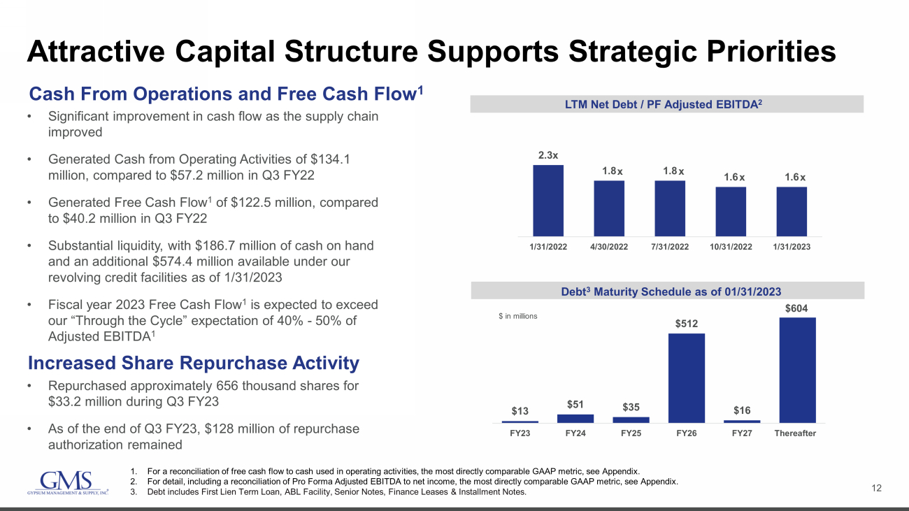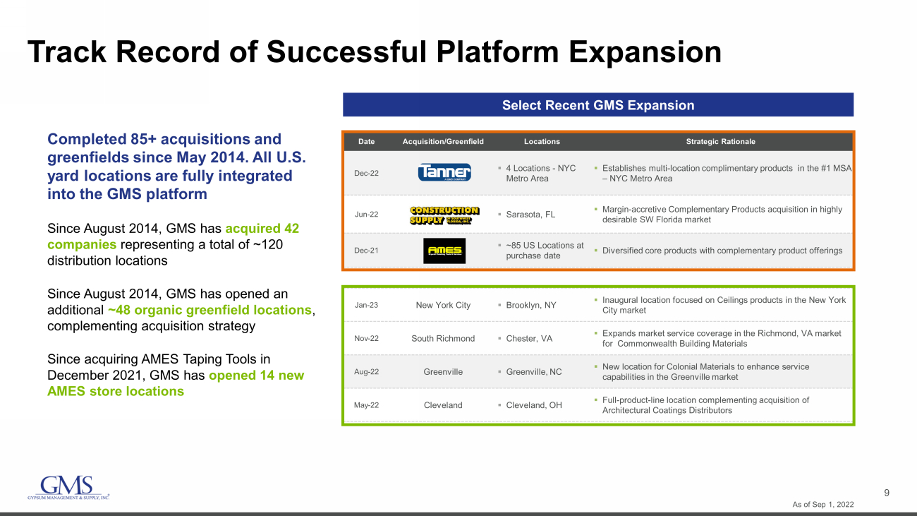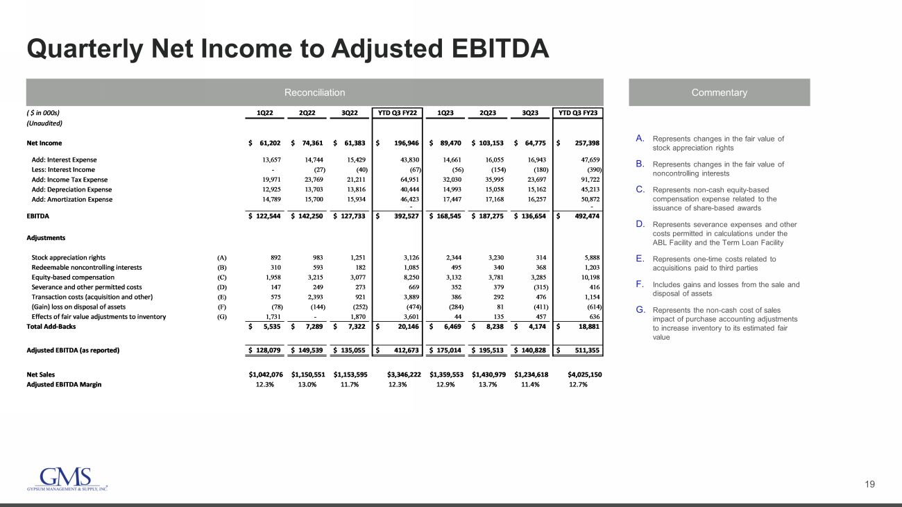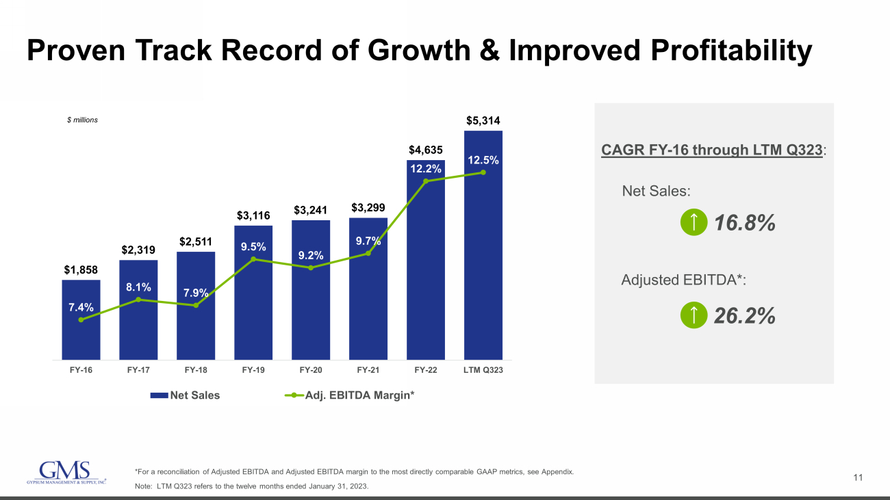 2 Safe Harbor and B asis of Presentation Forward - Looking Statement Safe Harbor — This presentation includes “forward - looking statements” within the meaning of the Private Securities Litigation Reform Act of 1995. You can generally identify forward - looking statements by the Company’s use of forward - looking terminology such as “anticipate,” “bel ieve,” “confident,” “continue,” “could,” “estimate,” “expect,” “intend,” “may,” “might,” “plan,” “potential,” “predict,” “seek,” or “should,” or the negative thereof or other variations th ere on or comparable terminology. In particular, statements about the markets in which GMS operates and our products, including potential growth in those markets and products, the economy general ly, our ability to continue successfully navigating the evolving operating environment and executing our business, strategic initiatives and priorities and growth potential, future M&A and greenfields , product availability, inflation, capital structure, pricing, volumes, net sales, organic sales, gross margins, incremental EBITDA, Adjusted EBITDA, Adjusted EBITDA ma rgi n, interest expense, tax rates, capital expenditures, free cash flow, cash flow generation and working capital management, future financial performance and liquidity, the ability of the Company to grow stronger, the ability to deliver growth, value creation and long - term success, and the Company’s cost reduction initiatives and results thereof contained in this present ation may be considered forward - looking statements. Statements about our expectations, beliefs, plans, strategies, objectives, prospects, assumptions or future events or perform anc e may be considered forward - looking statements. The Company has based forward - looking statements on its current expectations, assumptions, estimates and projections. While the Comp any believes these expectations, assumptions, estimates and projections are reasonable, such forward - looking statements are only predictions and involve known and unknown ris ks and uncertainties, many of which are beyond its control, including current public health issues that may affect the Company’s business. Forward - looking statements involve risks and uncertainties, including, but not limited to, those described in the “Risk Factors” section in the Company’s most recent Annual Report on Form 10 - K, and in its other periodic repor ts filed with the SEC. In addition, the statements in this release are made as of March 6, 2023. The Company undertakes no obligation to update any of the forward - looking statements made herein, whether as a result of new information, future events, changes in expectation or otherwise. These forward - looking statements should not be relied upon as representing t he Company’s views as of any date subsequent to March 6, 2023. Use of Non - GAAP and Adjusted Financial Information — To supplement GAAP financial information, we use adjusted measures of operating results which are non - GAAP measures. This non - GAAP adjusted financial information is provided as additional information for investors. These adjusted results exclude certain costs, expenses, gains and losses, and we believe their exclusion can enhance an overall understanding of our past financial performance and also our prospects for the fu ture. These adjustments to our GAAP results are made with the intent of providing both management and investors a more complete understanding of our operating performance by excl udi ng non - recurring, infrequent or other non - cash charges that are not believed to be material to the ongoing performance of our business. The presentation of this additional inf ormation is not meant to be considered in isolation or as a substitute for GAAP measures of net income, diluted earnings per share or net cash provided by (used in) operating activities pr epared in accordance with generally accepted accounting principles in the United States. Please see the Appendix to this presentation for a further discussion on these non - GAAP measure s and a reconciliation of these non - GAAP measures to the most directly comparable GAAP measures.
