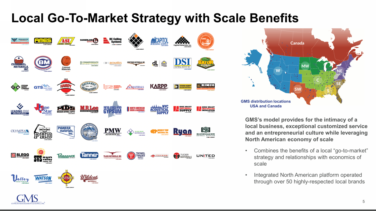 4 Providing Value to Contractors and Builders A leading North American specialty distributor of construction products GMS provides the products and value - added services to contractors who install wallboard, ceilings, steel framing and other complementary building products ​ • Expertise across local markets, leveraging scaled North American footprint​ • One - stop - shop for contractors with a broad product offering​ • Critical link between suppliers and a highly fragmented customer base​ Net Sales Breakdown (YTD Q3 FY23) 40% WALLBOARD 19% STEEL FRAMING 12% CEILINGS 29% COMPLEMENTARY PRODUCTS Note: YTD Q3 FY23 refers to the nine months ended January 31, 2023