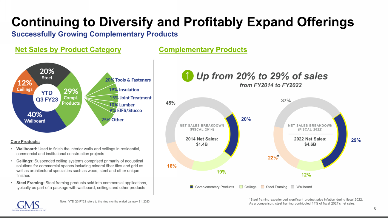 7 Strategic Growth Priorities – Q3 Fiscal 2023 Update Capitalize on existing fixed investments in locations and equipment where we are underpenetrated or below expected share Grow Complementary Product opportunities outside of core products to diversify and profitably expand our offerings Expand the platform through accretive acquisition and greenfield opportunities Leverage our scale and employ technology and best practices to deliver a best - in - class customer experience and further profit improvement • Industry data indicates full year calendar 2022 share growth in Wallboard and Steel Framing • Solid growth in Architectural Specialty Ceilings • Benefits of scale and our commitment to service provide value to our customers and confidence for continued growth in our core products • 11.7% net sales growth • 8.2% organic sales growth • 11 th straight quarter of growth for this category • Complementary Products has grown over time to contribute nearly 30% of our net sales • Made our first entries into the New York City market • Acquisition of Tanner Bolt & Nut, Inc. added four New York City metro area locations specializing in the distribution of tools & fasteners. Represents a platform from which we intend to expand our Tools & Fastener offerings in New York and the surrounding areas. • Also opened a Ceilings - focused greenfield in Brooklyn, NY in Jan. • Opened a greenfield yard location in Chester, VA in November • Also opened three new AMES store locations during the quarter • Net debt leverage at Jan. 31, 2023 was 1.6 times, down from 2.3 a year ago • Enhancing our role as a valuable partner by providing customers with the ability to easily transact with us, including online ordering, delivery status updates and proof of delivery notification and photos • Driving purchasing and operational efficiencies and helping to offset operational cost increases • Building our “Yard of the Future” to improve efficiency, productivity and profitability while delivering greater value to our customers and stakeholders • Organization - wide effort to reduce complexity cost Expand Share in Core Products Grow Complementary Products Platform Expansion Drive Improved Productivity & Profitability