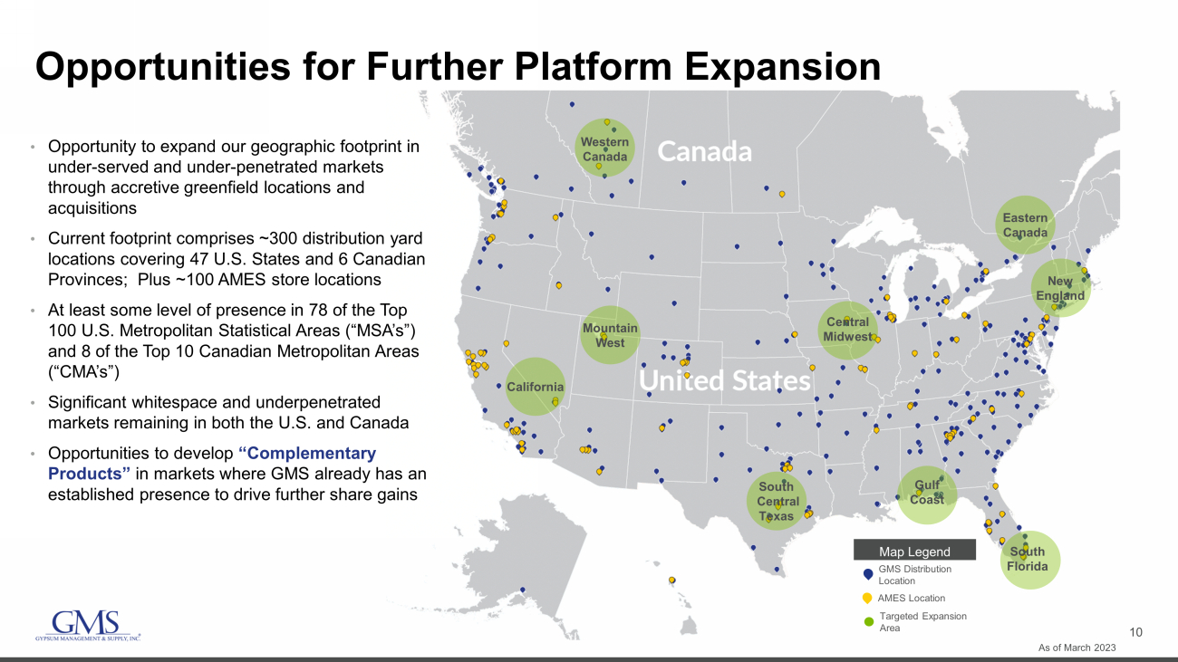 9 Track Record of Successful Platform Expansion Date Acquisition/Greenfield Locations Strategic Rationale Dec - 22 ▪ 4 Locations - NYC Metro Area ▪ Establishes multi - location complimentary products in the #1 MSA – NYC Metro Area Jun - 22 ▪ Sarasota, FL ▪ Margin - accretive Complementary Products acquisition in highly desirable SW Florida market Dec - 21 ▪ ~85 US Locations at purchase date ▪ Diversified core products with complementary product offerings Jan - 23 New York City ▪ Brooklyn, NY ▪ Inaugural location focused on Ceilings products in the New York City market Nov - 22 South Richmond ▪ Chester, VA ▪ Expands market service coverage in the Richmond, VA market for Commonwealth Building Materials Aug - 22 Greenville ▪ Greenville, NC ▪ New location for Colonial Materials to enhance service capabilities in the Greenville market May - 22 Cleveland ▪ Cleveland, OH ▪ Full - product - line location complementing acquisition of Architectural Coatings Distributors Completed 85+ acquisitions and greenfields since May 2014. All U.S. yard locations are fully integrated into the GMS platform Since August 2014, GMS has acquired 42 companies representing a total of ~120 distribution locations Since August 2014, GMS has opened an additional ~48 organic greenfield locations , complementing acquisition strategy Since acquiring AMES Taping Tools in December 2021, GMS has opened 14 new AMES store locations Select Recent GMS Expansion As of Sep 1, 2022