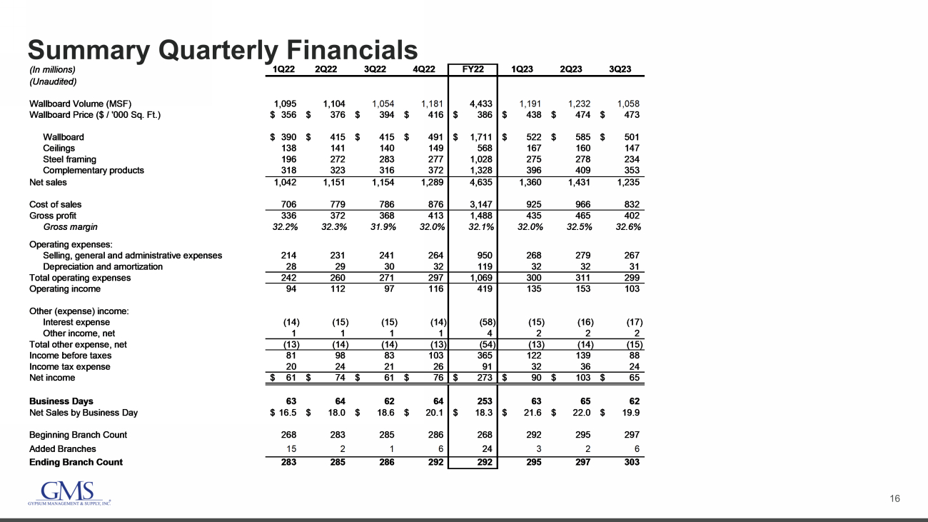 15 Expectations 1. For a reconciliation of Adjusted SG&A, Adjusted Net Income, Adjusted EBITDA, Adjusted EBITDA Margin and Free Cash Flow to the mo st directly comparable GAAP metrics, see Appendix. Expectations for Q4 Fiscal 2023 Wallboard Volume Expectations by End Market (as compared to Q4 FY22): • Q4 FY23 Multi - family YOY wallboard volume growth expected: >20% • Q4 FY23 Commercial YOY wallboard volume growth expected: Single - digits • Q4 FY23 Single - family YOY wallboard volume declines expected: High - teens Pricing Expectations (as compared to Q4 FY22): • Q4 FY23 Wallboard pricing: mid - to - high teen inflation • Q4 FY23 Ceilings pricing: flattish YOY • Q4 FY23 Complementary Product pricing: slightly inflationary • Q4 FY23 Steel Framing pricing: YOY decline of 20% - 25% Net Sales, Gross Margin and Adjusted EBITDA 1 Expectations: • Q4 FY23 Expected Year - Over - Year Net Sales: flat to down low - single - digits • Q4 FY23 Expected Gross Margin: Generally consistent with long - term trend, around 32% • Q4 FY23 Adjusted EBITDA 1 : In the range of $139 million to $144 million • FY23 Full year interest expense: ~$63 million • FY23 Cash tax rate for Adjusted Net Income 1 : ~25.5% • FY23 Full year capital expenditures: $40 million - $45 million • FY23 Free Cash Flow 1 : Approximately 55% of Fiscal 2023 Adjusted EBITDA 1 Full Year Fiscal 2023 Expectations