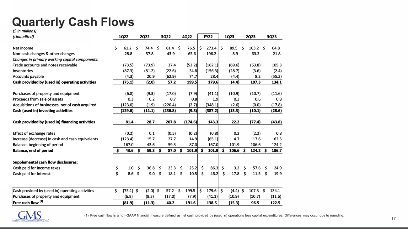 17 Quarterly Cash Flows (1) Free cash flow is a non - GAAP financial measure defined as net cash provided by (used in) operations less capital expenditures. D ifferences may occur due to rounding. ($ in millions) (Unaudited) 1Q22 2Q22 3Q22 4Q22 FY22 1Q23 2Q23 3Q23 Net income $ 61.2 $ 74.4 $ 61.4 $ 76.5 $ 273.4 $ 89.5 $ 103.2 $ 64.8 Non-cash changes & other changes 28.8 57.8 43.9 65.6 196.2 8.9 63.3 21.8 Changes in primary working capital components: Trade accounts and notes receivable (73.5) (73.9) 37.4 (52.2) (162.1) (69.6) (63.8) 105.3 Inventories (87.3) (81.2) (22.6) 34.8 (156.3) (28.7) (3.6) (2.4) Accounts payable (4.3) 20.9 (62.9) 74.7 28.4 (4.4) 8.2 (55.3) Cash provided by (used in) operating activities (75.1) (2.0) 57.2 199.5 179.6 (4.4) 107.3 134.1 Purchases of property and equipment (6.8) (9.3) (17.0) (7.9) (41.1) (10.9) (10.7) (11.6) Proceeds from sale of assets 0.3 0.2 0.7 0.8 1.9 0.3 0.6 0.8 Acquisitions of businesses, net of cash acquired (123.0) (1.9) (220.4) (2.7) (348.1) (2.6) (0.0) (17.8) Cash (used in) investing activities (129.6) (11.1) (236.8) (9.8) (387.2) (13.3) (10.1) (28.6) Cash provided by (used in) financing activities 81.4 28.7 207.8 (174.6) 143.3 22.2 (77.4) (43.8) Effect of exchange rates (0.2) 0.1 (0.5) (0.2) (0.8) 0.2 (2.2) 0.8 Increase (decrease) in cash and cash equivalents (123.4) 15.7 27.7 14.9 (65.1) 4.7 17.6 62.5 Balance, beginning of period 167.0 43.6 59.3 87.0 167.0 101.9 106.6 124.2 Balance, end of period $ 43.6 $ 59.3 $ 87.0 $ 101.9 $ 101.9 $ 106.6 $ 124.2 $ 186.7 Supplemental cash flow disclosures: Cash paid for income taxes $ 1.0 $ 36.8 $ 23.3 $ 25.2 $ 86.3 $ 3.2 $ 57.6 $ 24.9 Cash paid for interest $ 8.6 $ 9.0 $ 18.1 $ 10.5 $ 46.2 $ 17.8 $ 11.5 $ 19.9 Cash provided by (used in) operating activities $ (75.1) $ (2.0) $ 57.2 $ 199.5 $ 179.6 $ (4.4) $ 107.3 $ 134.1 Purchases of property and equipment (6.8) (9.3) (17.0) (7.9) (41.1) (10.9) (10.7) (11.6) Free cash flow (1) (81.9) (11.3) 40.2 191.6 138.5 (15.3) 96.5 122.5