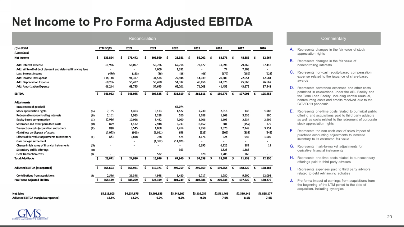 19 Quarterly Net Income to Adjusted EBITDA Reconciliation Commentary A. Represents changes in the fair value of stock appreciation rights B. Represents changes in the fair value of noncontrolling interests C. Represents non - cash equity - based compensation expense related to the issuance of share - based awards D. Represents severance expenses and other costs permitted in calculations under the ABL Facility and the Term Loan Facility E. Represents one - time costs related to acquisitions paid to third parties F. Includes gains and losses from the sale and disposal of assets G. Represents the non - cash cost of sales impact of purchase accounting adjustments to increase inventory to its estimated fair value ( $ in 000s) 1Q22 2Q22 3Q22 YTD Q3 FY22 1Q23 2Q23 3Q23 YTD Q3 FY23 (Unaudited) Net Income 61,202$ 74,361$ 61,383$ 196,946$ 89,470$ 103,153$ 64,775$ 257,398$ Add: Interest Expense 13,657 14,744 15,429 43,830 14,661 16,055 16,943 47,659 Less: Interest Income - (27) (40) (67) (56) (154) (180) (390) Add: Income Tax Expense 19,971 23,769 21,211 64,951 32,030 35,995 23,697 91,722 Add: Depreciation Expense 12,925 13,703 13,816 40,444 14,993 15,058 15,162 45,213 Add: Amortization Expense 14,789 15,700 15,934 46,423 17,447 17,168 16,257 50,872 - - EBITDA 122,544$ 142,250$ 127,733$ 392,527$ 168,545$ 187,275$ 136,654$ 492,474$ Adjustments Stock appreciation rights (A) 892 983 1,251 3,126 2,344 3,230 314 5,888 Redeemable noncontrolling interests (B) 310 593 182 1,085 495 340 368 1,203 Equity-based compensation (C) 1,958 3,215 3,077 8,250 3,132 3,781 3,285 10,198 Severance and other permitted costs (D) 147 249 273 669 352 379 (315) 416 Transaction costs (acquisition and other) (E) 575 2,393 921 3,889 386 292 476 1,154 (Gain) loss on disposal of assets (F) (78) (144) (252) (474) (284) 81 (411) (614) Effects of fair value adjustments to inventory (G) 1,731 - 1,870 3,601 44 135 457 636 Total Add-Backs 5,535$ 7,289$ 7,322$ 20,146$ 6,469$ 8,238$ 4,174$ 18,881$ Adjusted EBITDA (as reported) 128,079$ 149,539$ 135,055$ 412,673$ 175,014$ 195,513$ 140,828$ 511,355$ Net Sales $1,042,076 $1,150,551 $1,153,595 $3,346,222 $1,359,553 $1,430,979 $1,234,618 $4,025,150 Adjusted EBITDA Margin 12.3% 13.0% 11.7% 12.3% 12.9% 13.7% 11.4% 12.7%