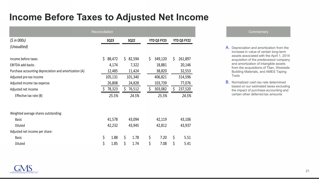 20 Net Income to Pro Forma Adjusted EBITDA Reconciliation Commentary A. Represents changes in the fair value of stock appreciation rights B. Represents changes in the fair value of noncontrolling interests C. Represents non - cash equity - based compensation expense related to the issuance of share - based awards D. Represents severance expenses and other costs permitted in calculations under the ABL Facility and the Term Loan Facility, including certain unusual, nonrecurring costs and credits received due to the COVID - 19 pandemic E. Represents one - time costs related to our initial public offering and acquisitions paid to third party advisors as well as costs related to the retirement of corporate stock appreciation rights F. Represents the non - cash cost of sales impact of purchase accounting adjustments to increase inventory to its estimated fair value G. Represents mark - to - market adjustments for derivative financial instruments H. Represents one - time costs related to our secondary offerings paid to third party advisors I. Represents expenses paid to third party advisors related to debt refinancing activities J. Pro forma impact of earnings from acquisitions from the beginning of the LTM period to the date of acquisition, including synergies ( $ in 000s) LTM 3Q23 2022 2021 2020 2019 2018 2017 2016 (Unaudited) Net Income 333,894$ 273,442$ 105,560$ 23,381$ 56,002$ 62,971$ 48,886$ 12,564$ Add: Interest Expense 61,926 58,097 53,786 67,718 73,677 31,395 29,360 37,418 Add: Write off of debt discount and deferred financing fees - - 4,606 1,331 - 74 7,103 - Less: Interest Income (486) (163) (86) (88) (66) (177) (152) (928) Add: Income Tax Expense 118,148 91,377 31,534 22,944 14,039 20,883 22,654 12,584 Add: Depreciation Expense 60,206 55,437 50,480 51,332 46,456 24,075 25,565 26,667 Add: Amortization Expense 68,244 63,795 57,645 65,201 71,003 41,455 43,675 37,548 EBITDA 641,932$ 541,985$ 303,525$ 231,819$ 261,111$ 180,676$ 177,091$ 125,853$ Adjustments Impairment of goodwill - - 63,074 - - - Stock appreciation rights (A) 7,165 4,403 3,173 1,572 2,730 2,318 148 1,988 Redeemable noncontrolling interests (B) 2,101 1,983 1,288 520 1,188 1,868 3,536 880 Equity-based compensation (C) 12,916 10,968 8,442 7,060 3,906 1,695 2,534 2,699 Severance and other permitted costs (D) 879 1,132 2,948 5,733 8,152 581 (157) 379 Transaction costs (acquisition and other) (E) 810 3,545 1,068 2,414 7,858 3,370 2,249 3,751 (Gain) loss on disposal of assets (1,053) (913) (1,011) 658 (525) (509) (338) (645) Effects of fair value adjustments to inventory (F) 853 3,818 788 575 4,176 324 946 1,009 Gain on legal settlement - (1,382) (14,029) - - - - Change in fair value of financial instruments (G) - - - - 6,395 6,125 382 19 Secondary public offerings (H) - - - 363 - 1,525 1,385 - Debt transaction costs (I) - - 532 - 678 1,285 265 - Total Add-Backs 23,671$ 24,936$ 15,846$ 67,940$ 34,558$ 18,582$ 11,138$ 12,330$ Adjusted EBITDA (as reported) 665,603$ 566,921$ 319,371$ 299,759$ 295,669$ 199,258$ 188,229$ 138,183$ Contributions from acquisitions (J) 2,536 21,348 4,948 1,480 6,717 1,280 9,500 12,093 Pro Forma Adjusted EBITDA 668,139$ 588,269$ 324,319$ 301,239$ 302,386$ 200,538$ 197,729$ 150,276$ Net Sales $5,313,803 $4,634,875 $3,298,823 $3,241,307 $3,116,032 $2,511,469 $2,319,146 $1,858,177 Adjusted EBITDA margin (as reported) 12.5% 12.2% 9.7% 9.2% 9.5% 7.9% 8.1% 7.4%