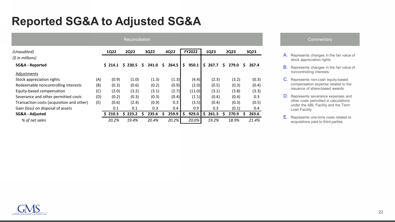 21 Income Before Taxes to Adjusted Net Income Reconciliation Commentary A. Depreciation and amortization from the increase in value of certain long - term assets associated with the April 1, 2014 acquisition of the predecessor company and amortization of intangible assets from the acquisitions of Titan, Westside Building Materials, and AMES Taping Tools B. Normalized cash tax rate determined based on our estimated taxes excluding the impact of purchase accounting and certain other deferred tax amounts ($ in 000s) 3Q23 3Q22 YTD Q3 FY23 YTD Q3 FY22 (Unaudited) Income before taxes 88,472$ 82,594$ 349,120$ 261,897$ EBITDA add-backs 4,174 7,322 18,881 20,146 Purchase accounting depreciation and amortization (A) 12,485 11,424 38,820 32,553 Adjusted pre-tax income 105,131 101,340 406,821 314,596 Adjusted income tax expense 26,808 24,828 103,739 77,076 Adjusted net income 78,323$ 76,512$ 303,082$ 237,520$ Effective tax rate (B) 25.5% 24.5% 25.5% 24.5% Weighted average shares outstanding: Basic 41,578 43,094 42,119 43,106 Diluted 42,232 43,945 42,812 43,937 Adjusted net income per share: Basic 1.88$ 1.78$ 7.20$ 5.51$ Diluted 1.85$ 1.74$ 7.08$ 5.41$