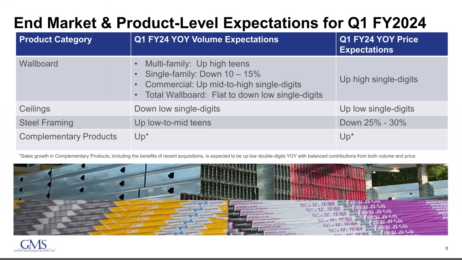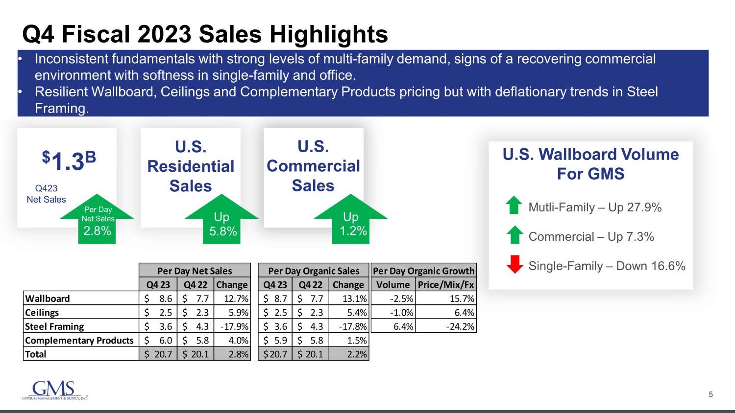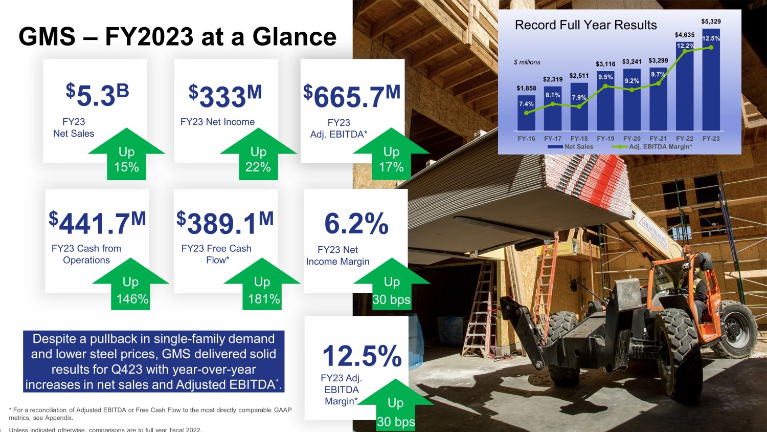 2 Safe Harbor and B asis of Presentation Forward - Looking Statement Safe Harbor — This presentation includes “forward - looking statements” within the meaning of the Private Securities Litigation Reform Act of 1995. You can generally identify forward - looking statements by the Company’s use of forward - looking terminology such as “anticipate,” “bel ieve,” “confident,” “continue,” “could,” “estimate,” “expect,” “intend,” “may,” “might,” “plan,” “potential,” “predict,” “seek,” or “should,” or the negative thereof or other variations th ere on or comparable terminology. In particular, statements about the markets in which GMS operates and our products, including potential growth in those markets and products, the economy general ly, our ability to continue successfully navigating the evolving operating environment and executing our business, strategic initiatives and priorities and growth potential, future M&A and greenfields , product availability, inflation, capital structure, pricing, volumes, net sales, organic sales, gross margins, incremental EBITDA, Adjusted EBITDA, Adjusted EBITDA ma rgi n, interest expense, tax rates, capital expenditures, free cash flow, cash flow generation and working capital management, future financial performance and liquidity, the ability of the Company to grow stronger, the ability to deliver growth, value creation and long - term success, and the Company’s cost reduction initiatives and results thereof contained in this present ation may be considered forward - looking statements. Statements about our expectations, beliefs, plans, strategies, objectives, prospects, assumptions or future events or perform anc e may be considered forward - looking statements. The Company has based forward - looking statements on its current expectations, assumptions, estimates and projections. While the Comp any believes these expectations, assumptions, estimates and projections are reasonable, such forward - looking statements are only predictions and involve known and unknown ris ks and uncertainties, many of which are beyond its control, including current public health issues that may affect the Company’s business. Forward - looking statements involve risks and uncertainties, including, but not limited to, those described in the “Risk Factors” section in the Company’s most recent Annual Report on Form 10 - K, and in its other periodic repor ts filed with the SEC. In addition, the statements in this release are made as of June 22, 2023. The Company undertakes no obligation to update any of the forward - looking statements made herein, whether as a result of new information, future events, changes in expectation or otherwise. These forward - looking statements should not be relied upon as representing t he Company’s views as of any date subsequent to June 22, 2023. Use of Non - GAAP and Adjusted Financial Information — To supplement GAAP financial information, we use adjusted measures of operating results which are non - GAAP measures. This non - GAAP adjusted financial information is provided as additional information for investors. These adjusted results exclude certain costs, expenses, gains and losses, and we believe their exclusion can enhance an overall understanding of our past financial performance and also our prospects for the fu ture. These adjustments to our GAAP results are made with the intent of providing both management and investors a more complete understanding of our operating performance by excl udi ng non - recurring, infrequent or other non - cash charges that are not believed to be material to the ongoing performance of our business. The presentation of this additional inf ormation is not meant to be considered in isolation or as a substitute for GAAP measures of net income, diluted earnings per share or net cash provided by (used in) operating activities pr epared in accordance with generally accepted accounting principles in the United States. Please see the Appendix to this presentation for a further discussion on these non - GAAP measure s and a reconciliation of these non - GAAP measures to the most directly comparable GAAP measures.