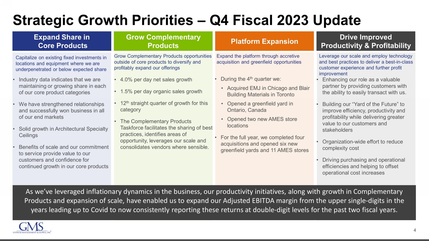 3 FY23 Net Income $ 333 M FY23 Cash from Operations GMS – FY2023 at a Glance FY23 Free Cash Flow* * For a reconciliation of Adjusted EBITDA or Free Cash Flow to the most directly comparable GAAP metrics, see Appendix. Unless indicated otherwise, comparisons are to full year fiscal 2022. FY23 Adj. EBITDA* $ 665.7 M FY23 Net Sales $ 5.3 B Up 15% Up 22% Up 17% $ 441.7 M Up 146% $ 389.1 M Up 181% 6.2% FY23 Net Income Margin Up 30 bps Despite a pullback in single - family demand and lower steel prices, GMS delivered solid results for Q423 with year - over - year increases in net sales and Adjusted EBITDA * . $1,858 $2,319 $2,511 $3,116 $3,241 $3,299 $4,635 $5,329 7.4% 8.1% 7.9% 9.5% 9.2% 9.7% 12.2% 12.5% FY-16 FY-17 FY-18 FY-19 FY-20 FY-21 FY-22 FY-23 Net Sales Adj. EBITDA Margin* $ millions Record Full Year Results 12.5% FY23 Adj. EBITDA Margin* Up 30 bps