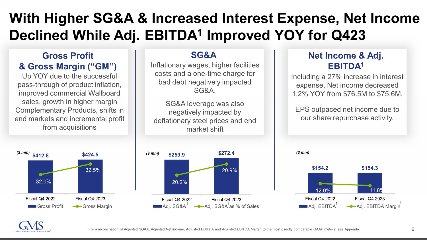 5 Q4 Fiscal 2023 Sales Highlights • Inconsistent fundamentals with strong levels of multi - family demand, signs of a recovering commercial environment with softness in single - family and office. • Resilient Wallboard, Ceilings and Complementary Products pricing but with deflationary trends in Steel Framing. U.S. Residential Sales Q423 Net Sales $ 1.3 B Up Up Per Day Net Sales 2.8% 5.8% U.S. Commercial Sales 1.2% U.S. Wallboard Volume For GMS Mutli - Family – Up 27.9% Commercial – Up 7.3% Single - Family – Down 16.6% Q4 23 Q4 22 Change Q4 23 Q4 22 Change Volume Price/Mix/Fx Wallboard 8.6$ 7.7$ 12.7% 8.7$ 7.7$ 13.1% -2.5% 15.7% Ceilings 2.5$ 2.3$ 5.9% 2.5$ 2.3$ 5.4% -1.0% 6.4% Steel Framing 3.6$ 4.3$ -17.9% 3.6$ 4.3$ -17.8% 6.4% -24.2% Complementary Products 6.0$ 5.8$ 4.0% 5.9$ 5.8$ 1.5% Total 20.7$ 20.1$ 2.8% 20.7$ 20.1$ 2.2% Per Day Net Sales Per Day Organic Sales Per Day Organic Growth
