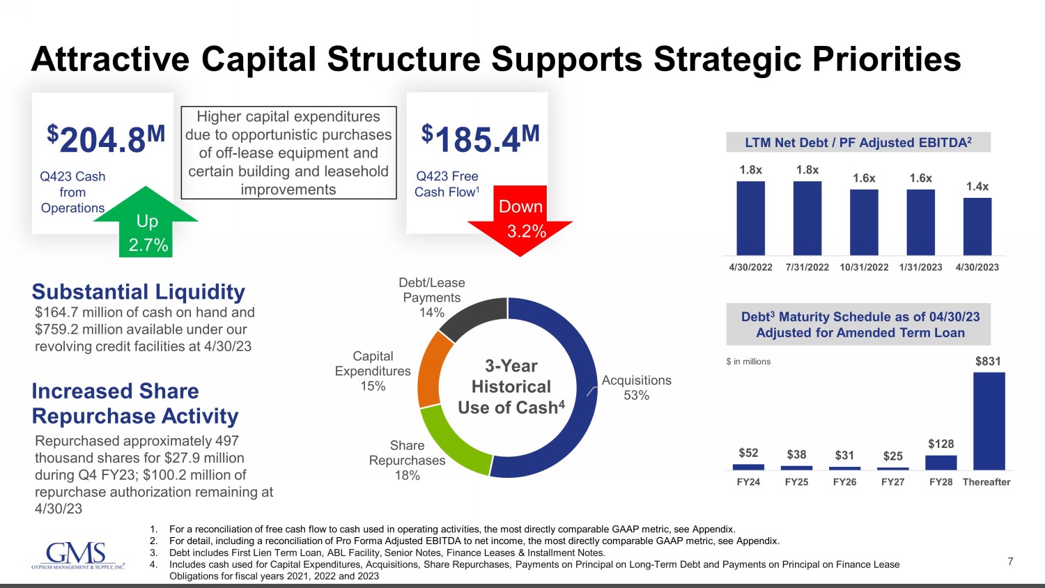 6 $412.8 $424.5 32.0% 32.5% 31.1% 31.6% 32.1% 32.6% $0 $50 $100 $150 $200 $250 $300 $350 $400 $450 $500 Fiscal Q4 2022 Fiscal Q4 2023 Gross Profit Gross Margin ($ mm) With Higher SG&A & Increased Interest Expense, Net Income Declined While Adj. EBITDA 1 Improved YOY for Q423 1 For a reconciliation of Adjusted SG&A, Adjusted Net Income, Adjusted EBITDA and Adjusted EBITDA Margin to the most directly c omp arable GAAP metrics, see Appendix. 1 1 1 $259.9 $272.4 20.2% 20.9% 19.0% 19.5% 20.0% 20.5% 21.0% 21.5% $0 $50 $100 $150 $200 $250 $300 Fiscal Q4 2022 Fiscal Q4 2023 Adj. SG&A Adj. SG&A as % of Sales ($ mm) 1 $154.2 $154.3 12.0% 11.8% 11.0% 11.5% 12.0% 12.5% 13.0% 13.5% 14.0% 14.5% 15.0% $0 $50 $100 $150 $200 $250 $300 Fiscal Q4 2022 Fiscal Q4 2023 Adj. EBITDA Adj. EBITDA Margin ($ mm) Gross Profit & Gross Margin (“GM”) Up YOY due to the successful pass - through of product inflation, improved commercial Wallboard sales, growth in higher margin Complementary Products, shifts in end markets and incremental profit from acquisitions SG&A SG&A leverage was also negatively impacted by deflationary steel prices and end market shift Inflationary wages, higher facilities costs and a one - time charge for bad debt negatively impacted SG&A. Net Income & Adj. EBITDA 1 EPS outpaced net income due to our share repurchase activity. Including a 27% increase in interest expense, Net income decreased 1.2% YOY from $76.5M to $75.6M.