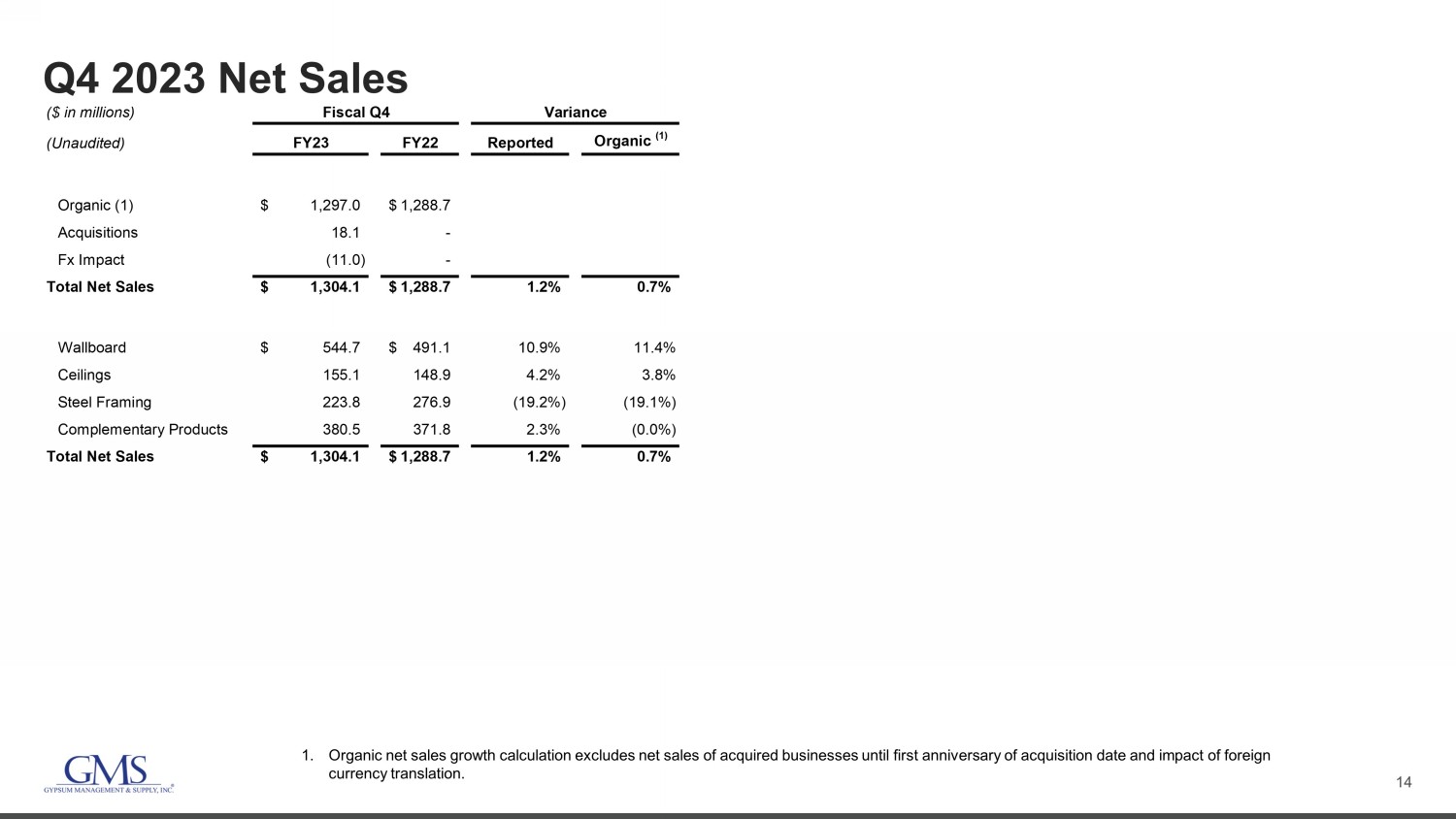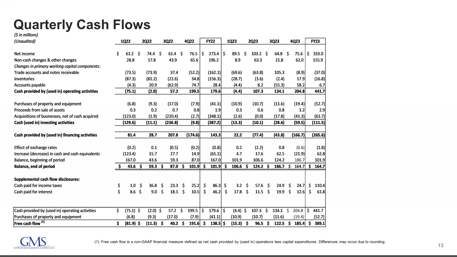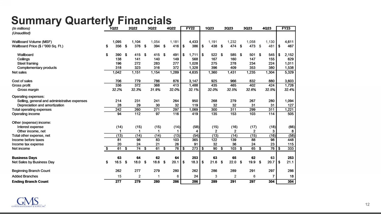12 Summary Quarterly Financials (In millions) 1Q22 2Q22 3Q22 4Q22 FY22 1Q23 2Q23 3Q23 4Q23 FY23 (Unaudited) Wallboard Volume (MSF) 1,095 1,104 1,054 1,181 4,433 1,191 1,232 1,058 1,130 4,611 Wallboard Price ($ / '000 Sq. Ft.) 356$ 376$ 394$ 416$ 386$ 438$ 474$ 473$ 481$ 467$ Wallboard 390$ 415$ 415$ 491$ 1,711$ 522$ 585$ 501$ 545$ 2,152$ Ceilings 138 141 140 149 568 167 160 147 155 629 Steel framing 196 272 283 277 1,028 275 278 234 224 1,011 Complementary products 318 323 316 372 1,328 396 409 353 380 1,538 Net sales 1,042 1,151 1,154 1,289 4,635 1,360 1,431 1,235 1,304 5,329 Cost of sales 706 779 786 876 3,147 925 966 832 880 3,603 Gross profit 336 372 368 413 1,488 435 465 402 424 1,726 Gross margin 32.2% 32.3% 31.9% 32.0% 32.1% 32.0% 32.5% 32.6% 32.5% 32.4% Operating expenses: Selling, general and administrative expenses 214 231 241 264 950 268 279 267 280 1,094 Depreciation and amortization 28 29 30 32 119 32 32 31 31 127 Total operating expenses 242 260 271 297 1,069 300 311 299 311 1,221 Operating income 94 112 97 116 419 135 153 103 114 505 Other (expense) income: Interest expense (14) (15) (15) (14) (58) (15) (16) (17) (18) (66) Other income, net 1 1 1 1 4 2 2 2 3 8 Total other expense, net (13) (14) (14) (13) (54) (13) (14) (15) (16) (58) Income before taxes 81 98 83 103 365 122 139 88 98 448 Income tax expense 20 24 21 26 91 32 36 24 23 115 Net income 61$ 74$ 61$ 76$ 273$ 90$ 103$ 65$ 76$ 333$ Business Days 63 64 62 64 253 63 65 62 63 253 Net Sales by Business Day 16.5$ 18.0$ 18.6$ 20.1$ 18.3$ 21.6$ 22.0$ 19.9$ 20.7$ 21.1$ Beginning Branch Count 262 277 279 280 262 286 289 291 297 286 Added Branches 15 2 1 6 24 3 2 6 7 18 Ending Branch Count 277 279 280 286 286 289 291 297 304 304