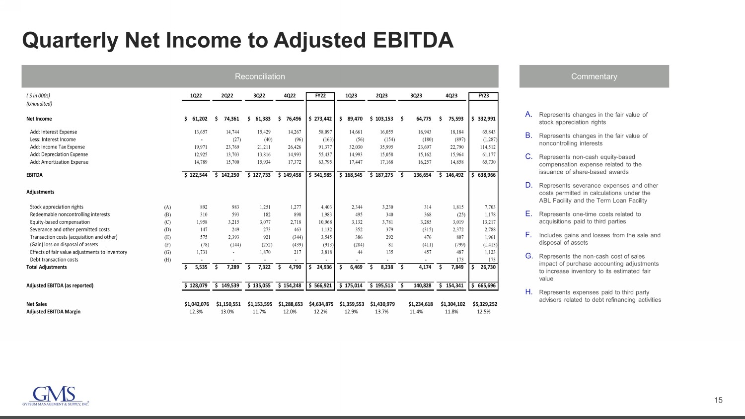 14 Q4 2023 Net Sales 1. Organic net sales growth calculation excludes net sales of acquired businesses until first anniversary of acquisition date an d i mpact of foreign currency translation. ($ in millions) (Unaudited) FY23 FY22 Reported Organic (1) Organic (1) 1,297.0$ 1,288.7$ Acquisitions 18.1 - Fx Impact (11.0) - Total Net Sales 1,304.1$ 1,288.7$ 1.2% 0.7% Wallboard 544.7$ 491.1$ 10.9% 11.4% Ceilings 155.1 148.9 4.2% 3.8% Steel Framing 223.8 276.9 (19.2%) (19.1%) Complementary Products 380.5 371.8 2.3% (0.0%) Total Net Sales 1,304.1$ 1,288.7$ 1.2% 0.7% Fiscal Q4 Variance