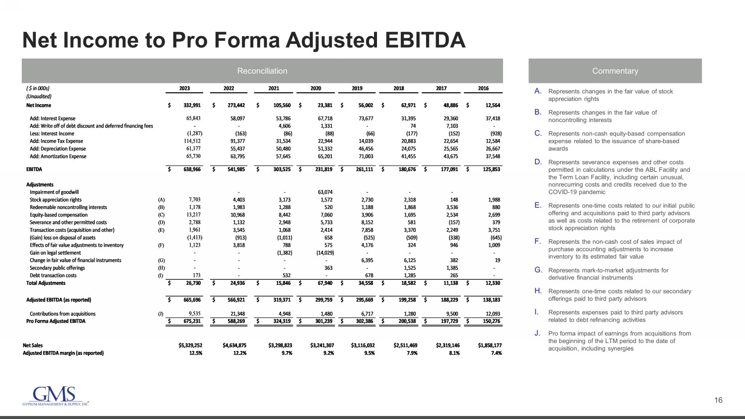 15 Quarterly Net Income to Adjusted EBITDA Reconciliation Commentary A. Represents changes in the fair value of stock appreciation rights B. Represents changes in the fair value of noncontrolling interests C. Represents non - cash equity - based compensation expense related to the issuance of share - based awards D. Represents severance expenses and other costs permitted in calculations under the ABL Facility and the Term Loan Facility E. Represents one - time costs related to acquisitions paid to third parties F. Includes gains and losses from the sale and disposal of assets G. Represents the non - cash cost of sales impact of purchase accounting adjustments to increase inventory to its estimated fair value H. Represents expenses paid to third party advisors related to debt refinancing activities ( $ in 000s) 1Q22 2Q22 3Q22 4Q22 FY22 1Q23 2Q23 3Q23 4Q23 FY23 (Unaudited) Net Income 61,202$ 74,361$ 61,383$ 76,496$ 273,442$ 89,470$ 103,153$ 64,775$ 75,593$ 332,991$ Add: Interest Expense 13,657 14,744 15,429 14,267 58,097 14,661 16,055 16,943 18,184 65,843 Less: Interest Income - (27) (40) (96) (163) (56) (154) (180) (897) (1,287) Add: Income Tax Expense 19,971 23,769 21,211 26,426 91,377 32,030 35,995 23,697 22,790 114,512 Add: Depreciation Expense 12,925 13,703 13,816 14,993 55,437 14,993 15,058 15,162 15,964 61,177 Add: Amortization Expense 14,789 15,700 15,934 17,372 63,795 17,447 17,168 16,257 14,858 65,730 EBITDA 122,544$ 142,250$ 127,733$ 149,458$ 541,985$ 168,545$ 187,275$ 136,654$ 146,492$ 638,966$ Adjustments Stock appreciation rights (A) 892 983 1,251 1,277 4,403 2,344 3,230 314 1,815 7,703 Redeemable noncontrolling interests (B) 310 593 182 898 1,983 495 340 368 (25) 1,178 Equity-based compensation (C) 1,958 3,215 3,077 2,718 10,968 3,132 3,781 3,285 3,019 13,217 Severance and other permitted costs (D) 147 249 273 463 1,132 352 379 (315) 2,372 2,788 Transaction costs (acquisition and other) (E) 575 2,393 921 (344) 3,545 386 292 476 807 1,961 (Gain) loss on disposal of assets (F) (78) (144) (252) (439) (913) (284) 81 (411) (799) (1,413) Effects of fair value adjustments to inventory (G) 1,731 - 1,870 217 3,818 44 135 457 487 1,123 Debt transaction costs (H) - - - - - - - - 173 173 Total Adjustments 5,535$ 7,289$ 7,322$ 4,790$ 24,936$ 6,469$ 8,238$ 4,174$ 7,849$ 26,730$ Adjusted EBITDA (as reported) 128,079$ 149,539$ 135,055$ 154,248$ 566,921$ 175,014$ 195,513$ 140,828$ 154,341$ 665,696$ Net Sales $1,042,076 $1,150,551 $1,153,595 $1,288,653 $4,634,875 $1,359,553 $1,430,979 $1,234,618 $1,304,102 $5,329,252 Adjusted EBITDA Margin 12.3% 13.0% 11.7% 12.0% 12.2% 12.9% 13.7% 11.4% 11.8% 12.5%