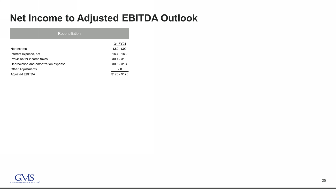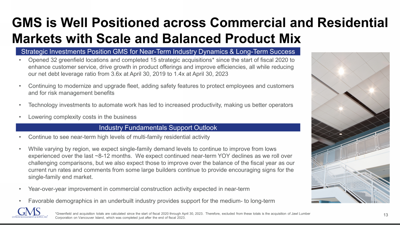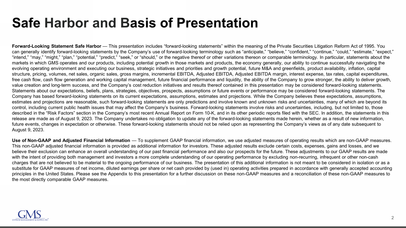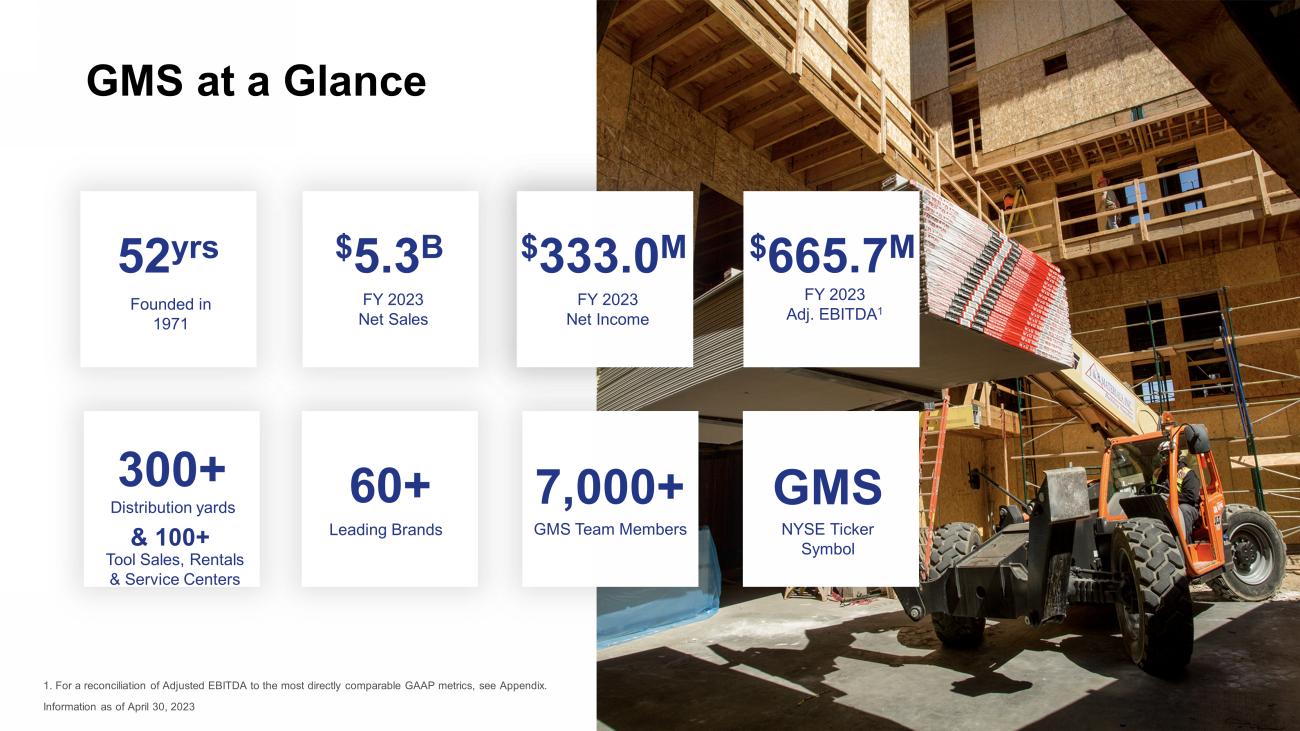 2 Safe Harbor and B asis of Presentation Forward - Looking Statement Safe Harbor — This presentation includes “forward - looking statements” within the meaning of the Private Securities Litigation Reform Act of 1995. You can generally identify forward - looking statements by the Company’s use of forward - looking terminology such as “anticipate,” “bel ieve,” “confident,” “continue,” “could,” “estimate,” “expect,” “intend,” “may,” “might,” “plan,” “potential,” “predict,” “seek,” or “should,” or the negative thereof or other variations th ere on or comparable terminology. In particular, statements about the markets in which GMS operates and our products, including potential growth in those markets and products, the economy general ly, our ability to continue successfully navigating the evolving operating environment and executing our business, strategic initiatives and priorities and growth potential, future M&A and greenfields , product availability, inflation, capital structure, pricing, volumes, net sales, organic sales, gross margins, incremental EBITDA, Adjusted EBITDA, Adjusted EBITDA ma rgi n, interest expense, tax rates, capital expenditures, free cash flow, cash flow generation and working capital management, future financial performance and liquidity, the ability of the Company to grow stronger, the ability to deliver growth, value creation and long - term success, and the Company’s cost reduction initiatives and results thereof contained in this present ation may be considered forward - looking statements. Statements about our expectations, beliefs, plans, strategies, objectives, prospects, assumptions or future events or perform anc e may be considered forward - looking statements. The Company has based forward - looking statements on its current expectations, assumptions, estimates and projections. While the Comp any believes these expectations, assumptions, estimates and projections are reasonable, such forward - looking statements are only predictions and involve known and unknown ris ks and uncertainties, many of which are beyond its control, including current public health issues that may affect the Company’s business. Forward - looking statements involve risks and uncertainties, including, but not limited to, those described in the “Risk Factors” section in the Company’s most recent Annual Report on Form 10 - K, and in its other periodic repor ts filed with the SEC. In addition, the statements in this release are made as of August 9, 2023. The Company undertakes no obligation to update any of the forward - looking statements made herein, whether as a result of new information, future events, changes in expectation or otherwise. These forward - looking statements should not be relied upon as representing t he Company’s views as of any date subsequent to August 9, 2023. Use of Non - GAAP and Adjusted Financial Information — To supplement GAAP financial information, we use adjusted measures of operating results which are non - GAAP measures. This non - GAAP adjusted financial information is provided as additional information for investors. These adjusted results exclude certain costs, expenses, gains and losses, and we believe their exclusion can enhance an overall understanding of our past financial performance and also our prospects for the fu ture. These adjustments to our GAAP results are made with the intent of providing both management and investors a more complete understanding of our operating performance by excl udi ng non - recurring, infrequent or other non - cash charges that are not believed to be material to the ongoing performance of our business. The presentation of this additional inf ormation is not meant to be considered in isolation or as a substitute for GAAP measures of net income, diluted earnings per share or net cash provided by (used in) operating activities pr epared in accordance with generally accepted accounting principles in the United States. Please see the Appendix to this presentation for a further discussion on these non - GAAP measure s and a reconciliation of these non - GAAP measures to the most directly comparable GAAP measures.