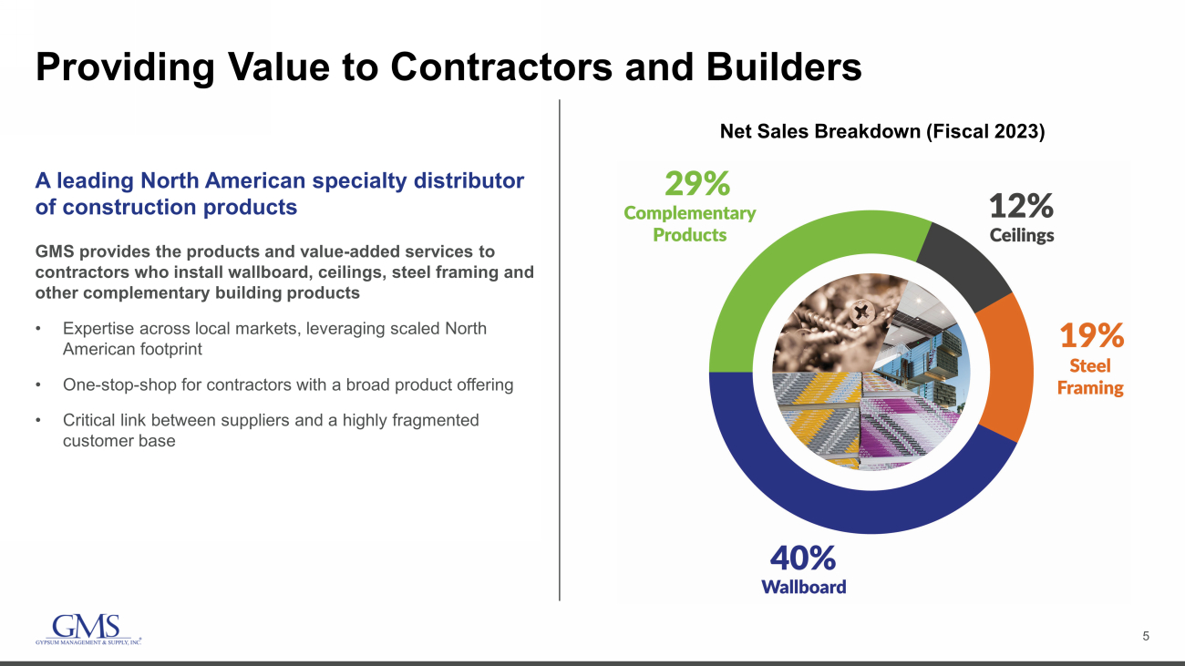 4 Diversified and Balanced End Market Exposure Diversified exposure across commercial and residential new and repair and remodel construction markets continues to be an advantage Residential • Single - Family New • Multi - Family New • Repair & Remodel ~45% Commercial • New Construction • Repair & Remodel ~55% While these percentages fluctuate from time to time as market conditions change, the numbers shown reflect the Company’s “thr oug h the cycle” expectations.