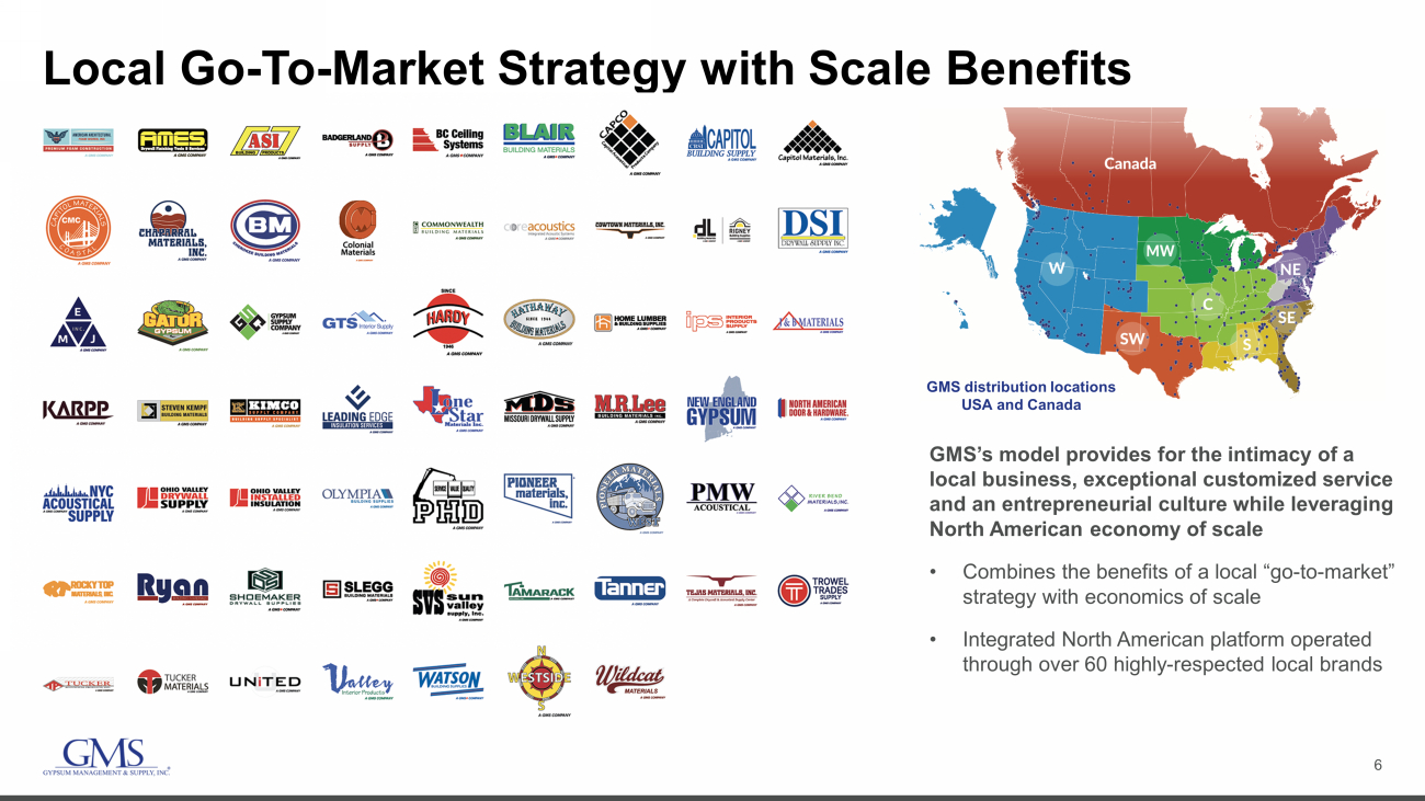 5 Providing Value to Contractors and Builders A leading North American specialty distributor of construction products GMS provides the products and value - added services to contractors who install wallboard, ceilings, steel framing and other complementary building products ​ • Expertise across local markets, leveraging scaled North American footprint​ • One - stop - shop for contractors with a broad product offering​ • Critical link between suppliers and a highly fragmented customer base​ Net Sales Breakdown (Fiscal 2023)