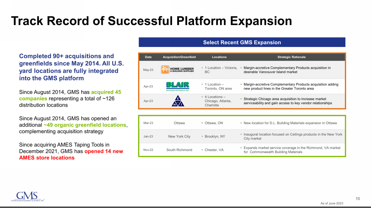 9 20% 19% 16% 45% 29% 12% 19% 40% Continuing to Diversify and Profitably Expand Offerings Successfully Growing Complementary Products Complementary Products 2014 Net Sales: $1.4B NET SALES BREAKDOWN (FISCAL 2014) 2023 Net Sales: $5.3B NET SALES BREAKDOWN (FISCAL 2023) Complementary Products Ceilings Steel Framing Wallboard Up from 20% to 29% of sales from FY2014 to FY2023 Net Sales by Product Category Core Products: • Wallboard: Used to finish the interior walls and ceilings in residential, commercial and institutional construction projects • Ceilings: Suspended ceiling systems comprised primarily of acoustical solutions for commercial spaces including mineral fiber tiles and grid as well as architectural specialties such as wood, steel and other unique finishes • Steel Framing: Steel framing products sold into commercial applications, typically as part of a package with wallboard, ceilings and other products *