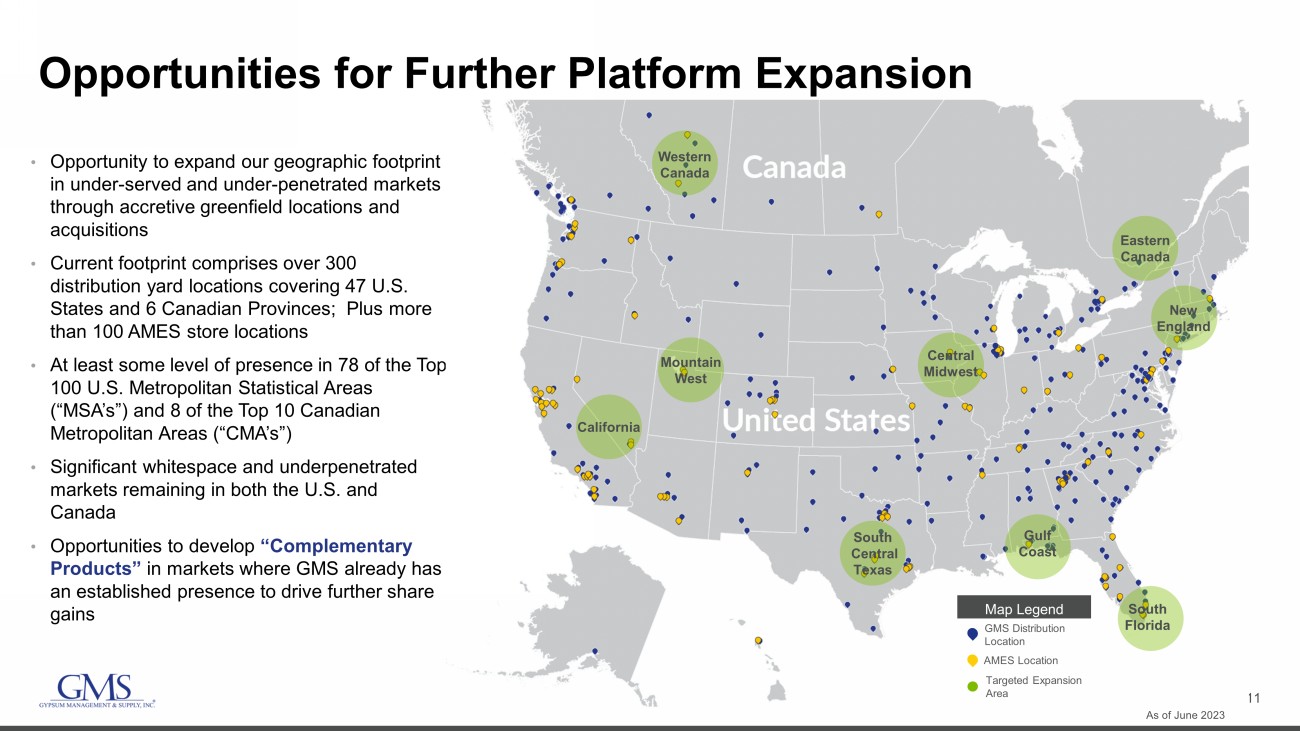 10 Track Record of Successful Platform Expansion Date Acquisition/Greenfield Locations Strategic Rationale May - 23 ▪ 1 Location – Victoria, BC ▪ Margin - accretive Complementary Products acquisition in desirable Vancouver Island market Apr - 23 ▪ 1 Location – Toronto, ON area ▪ Margin - accretive Complementary Products acquisition adding new product lines in the Greater Toronto area Apr - 23 ▪ 4 Locations – Chicago, Atlanta, Charlotte ▪ Strategic Chicago area acquisition to increase market serviceability and gain access to key vendor relationships Mar - 23 Ottawa ▪ Ottawa, ON ▪ New location for D.L. Building Materials expansion in Ottawa Jan - 23 New York City ▪ Brooklyn, NY ▪ Inaugural location focused on Ceilings products in the New York City market Nov - 22 South Richmond ▪ Chester, VA ▪ Expands market service coverage in the Richmond, VA market for Commonwealth Building Materials Completed 90+ acquisitions and greenfields since May 2014. All U.S. yard locations are fully integrated into the GMS platform Since August 2014, GMS has acquired 45 companies representing a total of ~126 distribution locations Since August 2014, GMS has opened an additional ~49 organic greenfield locations , complementing acquisition strategy Since acquiring AMES Taping Tools in December 2021, GMS has opened 14 new AMES store locations Select Recent GMS Expansion As of June 2023