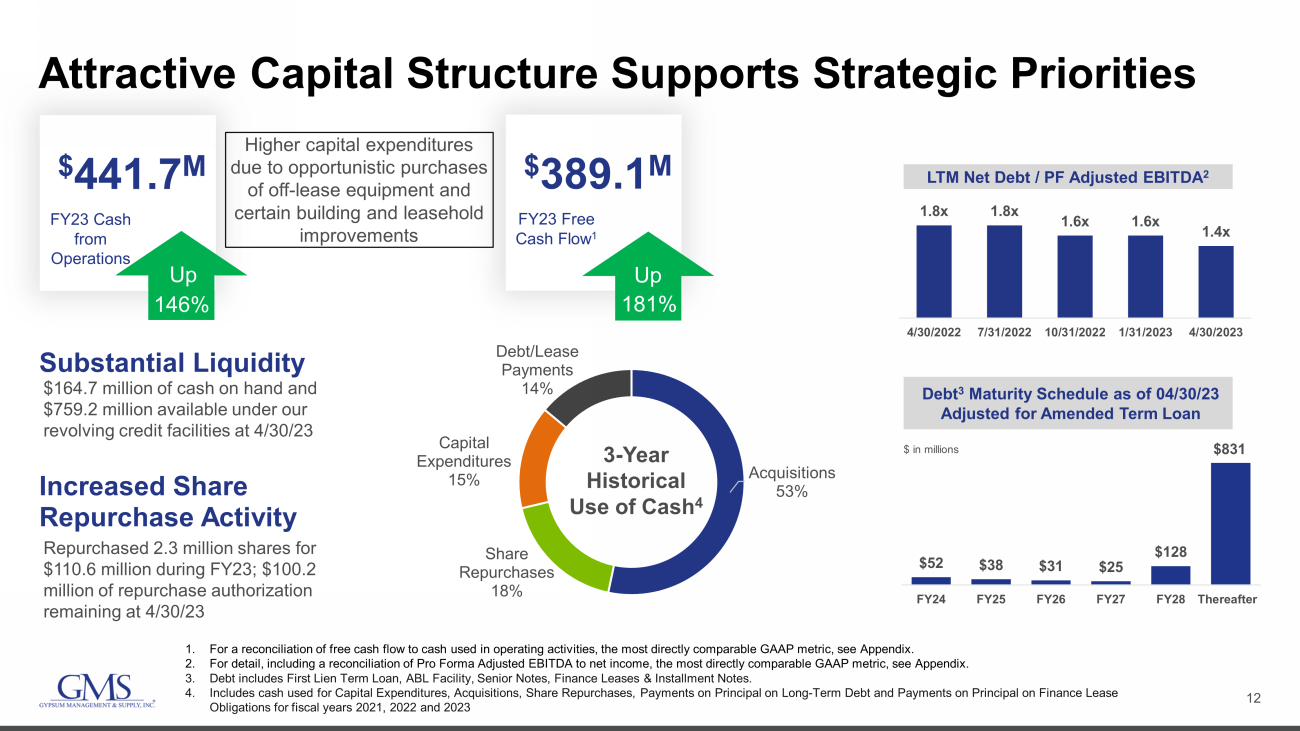 11 Opportunities for Further Platform Expansion • Opportunity to expand our geographic footprint in under - served and under - penetrated markets through accretive greenfield locations and acquisitions • Current footprint comprises over 300 distribution yard locations covering 47 U.S. States and 6 Canadian Provinces; Plus more than 100 AMES store locations • At least some level of presence in 78 of the Top 100 U.S. Metropolitan Statistical Areas (“MSA’s”) and 8 of the Top 10 Canadian Metropolitan Areas (“CMA’s”) • Significant whitespace and underpenetrated markets remaining in both the U.S. and Canada • Opportunities to develop “Complementary Products” in markets where GMS already has an established presence to drive further share gains As of June 2023 GMS Distribution Location Map Legend Targeted Expansion Area California Mountain West Western Canada South Central Texas Central Midwest Gulf Coast New England Eastern Canada South Florida AMES Location