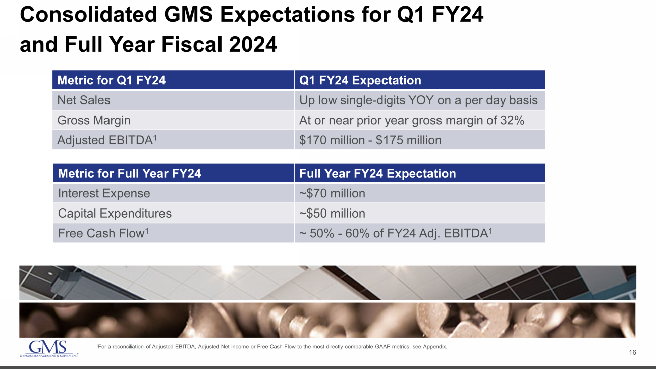 15 End Market & Product - Level Expectations for Q1 FY2024 Product Category Q1 FY24 YOY Volume Expectations Q1 FY24 YOY Price Expectations Wallboard • Multi - family: Up high teens • Single - family: Down 10 – 15% • Commercial: Up mid - to - high single - digits • Total Wallboard: Flat to down low single - digits Up high single - digits Ceilings Down low single - digits Up low single - digits Steel Framing Up low - to - mid teens Down 25% - 30% Complementary Products Up* Up* *Sales growth in Complementary Products, including the benefits of recent acquisitions, is expected to be up low double - digits Y OY with balanced contributions from both volume and price.
