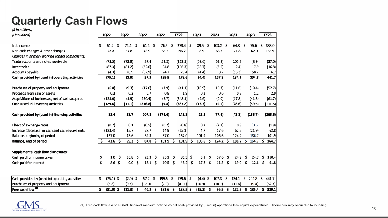 17 Summary Quarterly Financials (In millions) 1Q22 2Q22 3Q22 4Q22 FY22 1Q23 2Q23 3Q23 4Q23 FY23 (Unaudited) Wallboard Volume (MSF) 1,095 1,104 1,054 1,181 4,433 1,191 1,232 1,058 1,130 4,611 Wallboard Price ($ / '000 Sq. Ft.) 356$ 376$ 394$ 416$ 386$ 438$ 474$ 473$ 481$ 467$ Wallboard 390$ 415$ 415$ 491$ 1,711$ 522$ 585$ 501$ 545$ 2,152$ Ceilings 138 141 140 149 568 167 160 147 155 629 Steel framing 196 272 283 277 1,028 275 278 234 224 1,011 Complementary products 318 323 316 372 1,328 396 409 353 380 1,538 Net sales 1,042 1,151 1,154 1,289 4,635 1,360 1,431 1,235 1,304 5,329 Cost of sales 706 779 786 876 3,147 925 966 832 880 3,603 Gross profit 336 372 368 413 1,488 435 465 402 424 1,726 Gross margin 32.2% 32.3% 31.9% 32.0% 32.1% 32.0% 32.5% 32.6% 32.5% 32.4% Operating expenses: Selling, general and administrative expenses 214 231 241 264 950 268 279 267 280 1,094 Depreciation and amortization 28 29 30 32 119 32 32 31 31 127 Total operating expenses 242 260 271 297 1,069 300 311 299 311 1,221 Operating income 94 112 97 116 419 135 153 103 114 505 Other (expense) income: Interest expense (14) (15) (15) (14) (58) (15) (16) (17) (18) (66) Other income, net 1 1 1 1 4 2 2 2 3 8 Total other expense, net (13) (14) (14) (13) (54) (13) (14) (15) (16) (58) Income before taxes 81 98 83 103 365 122 139 88 98 448 Income tax expense 20 24 21 26 91 32 36 24 23 115 Net income 61$ 74$ 61$ 76$ 273$ 90$ 103$ 65$ 76$ 333$ Business Days 63 64 62 64 253 63 65 62 63 253 Net Sales by Business Day 16.5$ 18.0$ 18.6$ 20.1$ 18.3$ 21.6$ 22.0$ 19.9$ 20.7$ 21.1$ Beginning Branch Count 262 277 279 280 262 286 289 291 297 286 Added Branches 15 2 1 6 24 3 2 6 7 18 Ending Branch Count 277 279 280 286 286 289 291 297 304 304