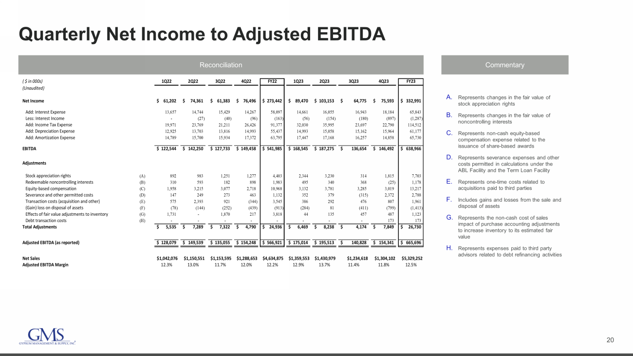 19 Q4 2023 Net Sales 1. Organic net sales growth calculation excludes net sales of acquired businesses until first anniversary of acquisition date an d i mpact of foreign currency translation. ($ in millions) (Unaudited) FY23 FY22 Reported Organic (1) Organic (1) 1,297.0$ 1,288.7$ Acquisitions 18.1 - Fx Impact (11.0) - Total Net Sales 1,304.1$ 1,288.7$ 1.2% 0.7% Wallboard 544.7$ 491.1$ 10.9% 11.4% Ceilings 155.1 148.9 4.2% 3.8% Steel Framing 223.8 276.9 (19.2%) (19.1%) Complementary Products 380.5 371.8 2.3% (0.0%) Total Net Sales 1,304.1$ 1,288.7$ 1.2% 0.7% Fiscal Q4 Variance