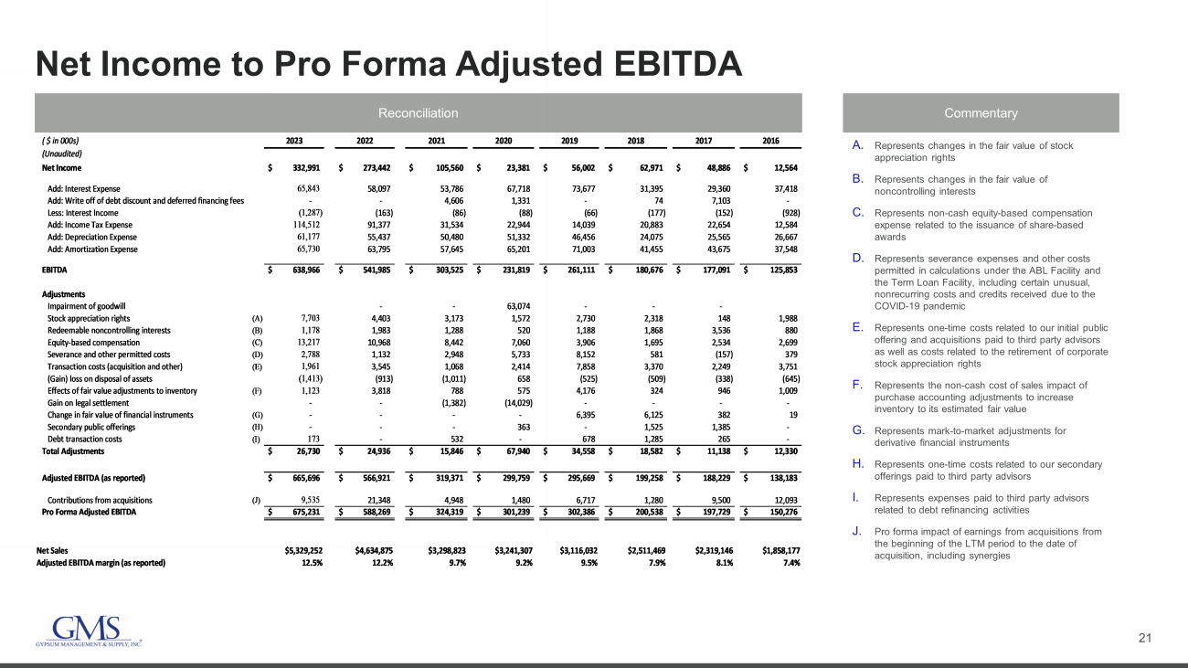 20 Quarterly Net Income to Adjusted EBITDA Reconciliation Commentary A. Represents changes in the fair value of stock appreciation rights B. Represents changes in the fair value of noncontrolling interests C. Represents non - cash equity - based compensation expense related to the issuance of share - based awards D. Represents severance expenses and other costs permitted in calculations under the ABL Facility and the Term Loan Facility E. Represents one - time costs related to acquisitions paid to third parties F. Includes gains and losses from the sale and disposal of assets G. Represents the non - cash cost of sales impact of purchase accounting adjustments to increase inventory to its estimated fair value H. Represents expenses paid to third party advisors related to debt refinancing activities ( $ in 000s) 1Q22 2Q22 3Q22 4Q22 FY22 1Q23 2Q23 3Q23 4Q23 FY23 (Unaudited) Net Income 61,202$ 74,361$ 61,383$ 76,496$ 273,442$ 89,470$ 103,153$ 64,775$ 75,593$ 332,991$ Add: Interest Expense 13,657 14,744 15,429 14,267 58,097 14,661 16,055 16,943 18,184 65,843 Less: Interest Income - (27) (40) (96) (163) (56) (154) (180) (897) (1,287) Add: Income Tax Expense 19,971 23,769 21,211 26,426 91,377 32,030 35,995 23,697 22,790 114,512 Add: Depreciation Expense 12,925 13,703 13,816 14,993 55,437 14,993 15,058 15,162 15,964 61,177 Add: Amortization Expense 14,789 15,700 15,934 17,372 63,795 17,447 17,168 16,257 14,858 65,730 EBITDA 122,544$ 142,250$ 127,733$ 149,458$ 541,985$ 168,545$ 187,275$ 136,654$ 146,492$ 638,966$ Adjustments Stock appreciation rights (A) 892 983 1,251 1,277 4,403 2,344 3,230 314 1,815 7,703 Redeemable noncontrolling interests (B) 310 593 182 898 1,983 495 340 368 (25) 1,178 Equity-based compensation (C) 1,958 3,215 3,077 2,718 10,968 3,132 3,781 3,285 3,019 13,217 Severance and other permitted costs (D) 147 249 273 463 1,132 352 379 (315) 2,372 2,788 Transaction costs (acquisition and other) (E) 575 2,393 921 (344) 3,545 386 292 476 807 1,961 (Gain) loss on disposal of assets (F) (78) (144) (252) (439) (913) (284) 81 (411) (799) (1,413) Effects of fair value adjustments to inventory (G) 1,731 - 1,870 217 3,818 44 135 457 487 1,123 Debt transaction costs (H) - - - - - - - - 173 173 Total Adjustments 5,535$ 7,289$ 7,322$ 4,790$ 24,936$ 6,469$ 8,238$ 4,174$ 7,849$ 26,730$ Adjusted EBITDA (as reported) 128,079$ 149,539$ 135,055$ 154,248$ 566,921$ 175,014$ 195,513$ 140,828$ 154,341$ 665,696$ Net Sales $1,042,076 $1,150,551 $1,153,595 $1,288,653 $4,634,875 $1,359,553 $1,430,979 $1,234,618 $1,304,102 $5,329,252 Adjusted EBITDA Margin 12.3% 13.0% 11.7% 12.0% 12.2% 12.9% 13.7% 11.4% 11.8% 12.5%