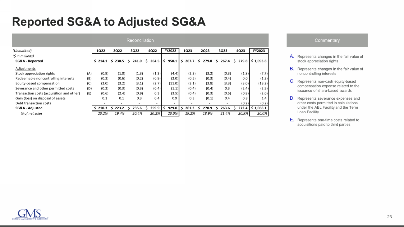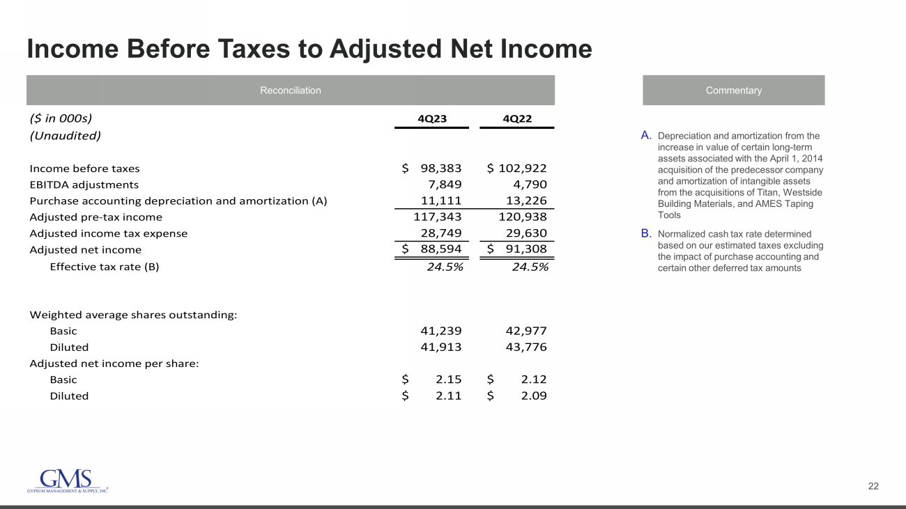21 Net Income to Pro Forma Adjusted EBITDA Reconciliation Commentary A. Represents changes in the fair value of stock appreciation rights B. Represents changes in the fair value of noncontrolling interests C. Represents non - cash equity - based compensation expense related to the issuance of share - based awards D. Represents severance expenses and other costs permitted in calculations under the ABL Facility and the Term Loan Facility, including certain unusual, nonrecurring costs and credits received due to the COVID - 19 pandemic E. Represents one - time costs related to our initial public offering and acquisitions paid to third party advisors as well as costs related to the retirement of corporate stock appreciation rights F. Represents the non - cash cost of sales impact of purchase accounting adjustments to increase inventory to its estimated fair value G. Represents mark - to - market adjustments for derivative financial instruments H. Represents one - time costs related to our secondary offerings paid to third party advisors I. Represents expenses paid to third party advisors related to debt refinancing activities J. Pro forma impact of earnings from acquisitions from the beginning of the LTM period to the date of acquisition, including synergies ( $ in 000s) 2023 2022 2021 2020 2019 2018 2017 2016 (Unaudited) Net Income 332,991$ 273,442$ 105,560$ 23,381$ 56,002$ 62,971$ 48,886$ 12,564$ Add: Interest Expense 65,843 58,097 53,786 67,718 73,677 31,395 29,360 37,418 Add: Write off of debt discount and deferred financing fees - - 4,606 1,331 - 74 7,103 - Less: Interest Income (1,287) (163) (86) (88) (66) (177) (152) (928) Add: Income Tax Expense 114,512 91,377 31,534 22,944 14,039 20,883 22,654 12,584 Add: Depreciation Expense 61,177 55,437 50,480 51,332 46,456 24,075 25,565 26,667 Add: Amortization Expense 65,730 63,795 57,645 65,201 71,003 41,455 43,675 37,548 EBITDA 638,966$ 541,985$ 303,525$ 231,819$ 261,111$ 180,676$ 177,091$ 125,853$ Adjustments Impairment of goodwill - - 63,074 - - - Stock appreciation rights (A) 7,703 4,403 3,173 1,572 2,730 2,318 148 1,988 Redeemable noncontrolling interests (B) 1,178 1,983 1,288 520 1,188 1,868 3,536 880 Equity-based compensation (C) 13,217 10,968 8,442 7,060 3,906 1,695 2,534 2,699 Severance and other permitted costs (D) 2,788 1,132 2,948 5,733 8,152 581 (157) 379 Transaction costs (acquisition and other) (E) 1,961 3,545 1,068 2,414 7,858 3,370 2,249 3,751 (Gain) loss on disposal of assets (1,413) (913) (1,011) 658 (525) (509) (338) (645) Effects of fair value adjustments to inventory (F) 1,123 3,818 788 575 4,176 324 946 1,009 Gain on legal settlement - - (1,382) (14,029) - - - - Change in fair value of financial instruments (G) - - - - 6,395 6,125 382 19 Secondary public offerings (H) - - - 363 - 1,525 1,385 - Debt transaction costs (I) 173 - 532 - 678 1,285 265 - Total Adjustments 26,730$ 24,936$ 15,846$ 67,940$ 34,558$ 18,582$ 11,138$ 12,330$ Adjusted EBITDA (as reported) 665,696$ 566,921$ 319,371$ 299,759$ 295,669$ 199,258$ 188,229$ 138,183$ Contributions from acquisitions (J) 9,535 21,348 4,948 1,480 6,717 1,280 9,500 12,093 Pro Forma Adjusted EBITDA 675,231$ 588,269$ 324,319$ 301,239$ 302,386$ 200,538$ 197,729$ 150,276$ Net Sales $5,329,252 $4,634,875 $3,298,823 $3,241,307 $3,116,032 $2,511,469 $2,319,146 $1,858,177 Adjusted EBITDA margin (as reported) 12.5% 12.2% 9.7% 9.2% 9.5% 7.9% 8.1% 7.4%