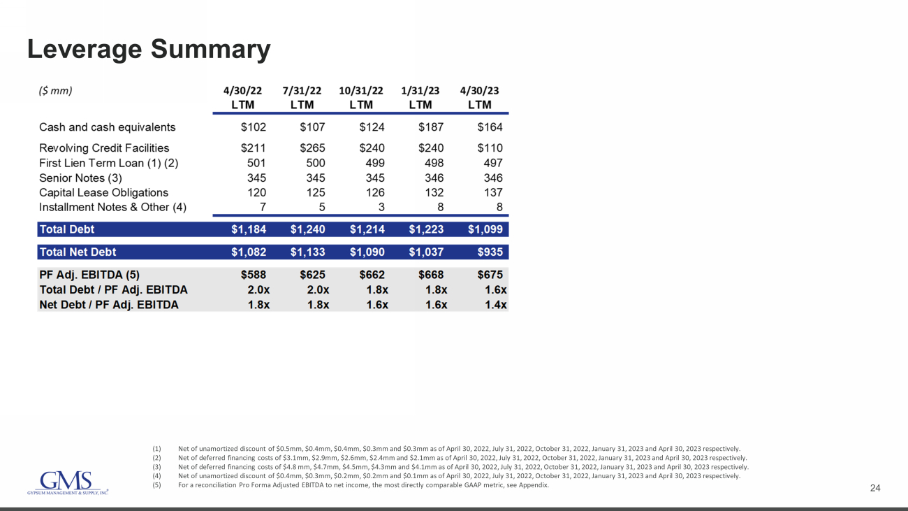 23 Reported SG&A to Adjusted SG&A Reconciliation Commentary A. Represents changes in the fair value of stock appreciation rights B. Represents changes in the fair value of noncontrolling interests C. Represents non - cash equity - based compensation expense related to the issuance of share - based awards D. Represents severance expenses and other costs permitted in calculations under the ABL Facility and the Term Loan Facility E. Represents one - time costs related to acquisitions paid to third parties (Unaudited) 1Q22 2Q22 3Q22 4Q22 FY2022 1Q23 2Q23 3Q23 4Q23 FY2023 ($ in millions) SG&A - Reported 214.1$ 230.5$ 241.0$ 264.5$ 950.1$ 267.7$ 279.0$ 267.4$ 279.8$ 1,093.8$ Adjustments Stock appreciation rights (A) (0.9) (1.0) (1.3) (1.3) (4.4) (2.3) (3.2) (0.3) (1.8) (7.7) Redeemable noncontrolling interests (B) (0.3) (0.6) (0.2) (0.9) (2.0) (0.5) (0.3) (0.4) 0.0 (1.2) Equity-based compensation (C) (2.0) (3.2) (3.1) (2.7) (11.0) (3.1) (3.8) (3.3) (3.0) (13.2) Severance and other permitted costs (D) (0.2) (0.3) (0.3) (0.4) (1.1) (0.4) (0.4) 0.3 (2.4) (2.9) Transaction costs (acquisition and other) (E) (0.6) (2.4) (0.9) 0.3 (3.5) (0.4) (0.3) (0.5) (0.8) (2.0) Gain (loss) on disposal of assets 0.1 0.1 0.3 0.4 0.9 0.3 (0.1) 0.4 0.8 1.4 Debt transaction costs - - - - - - - - (0.2) (0.2) SG&A - Adjusted 210.3$ 223.2$ 235.6$ 259.9$ 929.0$ 261.3$ 270.9$ 263.6$ 272.4$ 1,068.1$ % of net sales 20.2% 19.4% 20.4% 20.2% 20.0% 19.2% 18.9% 21.4% 20.9% 20.0%