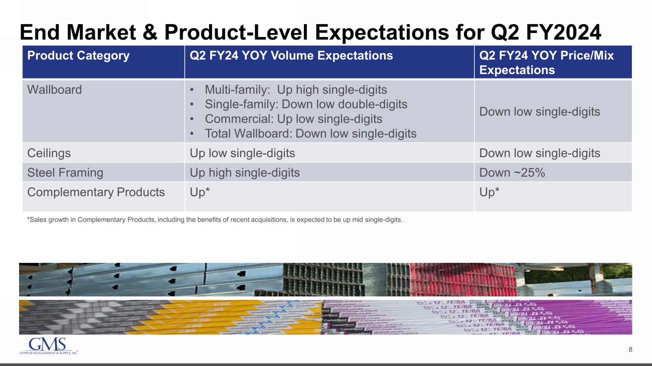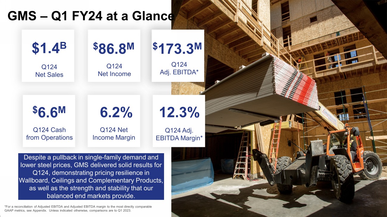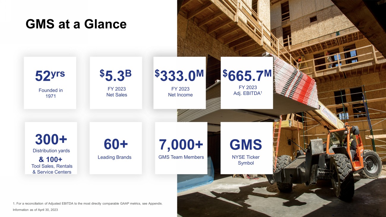 2 Safe Harbor and B asis of Presentation Forward - Looking Statement Safe Harbor — This presentation includes “forward - looking statements” within the meaning of the Private Securities Litigation Reform Act of 1995. You can generally identify forward - looking statements by the Company’s use of forward - looking terminology such as “anticipate,” “bel ieve,” “confident,” “continue,” “could,” “estimate,” “expect,” “intend,” “may,” “might,” “plan,” “potential,” “predict,” “seek,” or “should,” or the negative thereof or other variations th ere on or comparable terminology. In particular, statements about the markets in which GMS operates and our products, including potential or expected growth in those markets and products, the eco nom y generally, our ability to continue successfully navigating the evolving operating environment and executing our business, strategic initiatives and priorities and growth pot ent ial, future M&A and greenfields, inflation, capital structure, pricing, volumes, net sales, organic sales, gross margins, incremental EBITDA, Adjusted EBITDA, Adjusted EBITDA margin, inter est expense, tax rates, capital expenditures, free cash flow, future financial performance and liquidity, and the ability of the Company to grow stronger contained in this presentat ion may be considered forward - looking statements. Statements about our expectations, beliefs, plans, strategies, objectives, prospects, assumptions or future events or performance may be co nsidered forward - looking statements. The Company has based forward - looking statements on its current expectations, assumptions, estimates and projections. While the Company believes these expectations, assumptions, estimates and projections are reasonable, such forward - looking statements are only predictions and involve known and unknown risks and uncerta inties, many of which are beyond its control, including current public health issues that may affect the Company’s business. Forward - looking statements involve risks and uncertainties, including, but not limited to, those described in the “Risk Factors” section in the Company’s most recent Annual Report on Form 10 - K, and in its other periodic reports filed with the SEC. In addition, the statements in this release are made as of August 31, 2023. The Company undertakes no obligation to update any of the forward - looking statements made herein, whether as a result of new information, future events, changes in expectation or otherwise. These forward - looking statements should not be relied upon as representing the Company’s views as of a ny date subsequent to August 31, 2023. Use of Non - GAAP and Adjusted Financial Information — To supplement GAAP financial information, we use adjusted measures of operating results which are non - GAAP measures. This non - GAAP adjusted financial information is provided as additional information for investors. These adjusted results exclude certain costs, expenses, gains and losses, and we believe their exclusion can enhance an overall understanding of our past financial performance and also our prospects for the fu ture. These adjustments to our GAAP results are made with the intent of providing both management and investors a more complete understanding of our operating performance by excl udi ng non - recurring, infrequent or other non - cash charges that are not believed to be material to the ongoing performance of our business. The presentation of this additional inf ormation is not meant to be considered in isolation or as a substitute for GAAP measures of net income, diluted earnings per share or net cash provided by (used in) operating activities pr epared in accordance with generally accepted accounting principles in the United States. Please see the Appendix to this presentation for a further discussion on these non - GAAP measure s and a reconciliation of these non - GAAP measures to the most directly comparable GAAP measures.