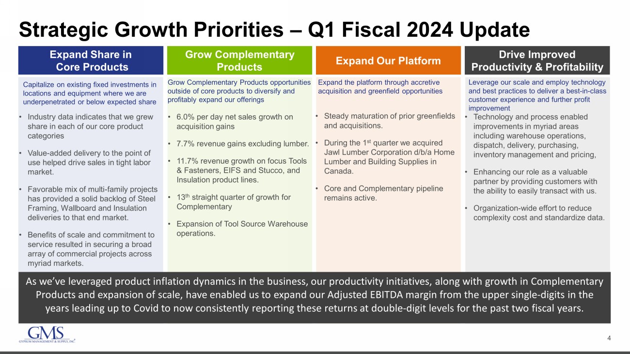 3 Q124 Net Income $ 86.8 M Q124 Cash from Operations GMS – Q1 FY24 at a Glance Q124 Net Income Margin *For a reconciliation of Adjusted EBITDA and Adjusted EBITDA margin to the most directly comparable GAAP metrics, see Appendix. Unless indicated otherwise, comparisons are to Q1 2023. Q124 Adj. EBITDA* $ 173.3 M Q124 Net Sales $1.4 B $ 6.6 M 12.3% Q124 Adj. EBITDA Margin* Despite a pullback in single - family demand and lower steel prices, GMS delivered solid results for Q124, demonstrating pricing resilience in Wallboard, Ceilings and Complementary Products, as well as the strength and stability that our balanced end markets provide. 6.2%