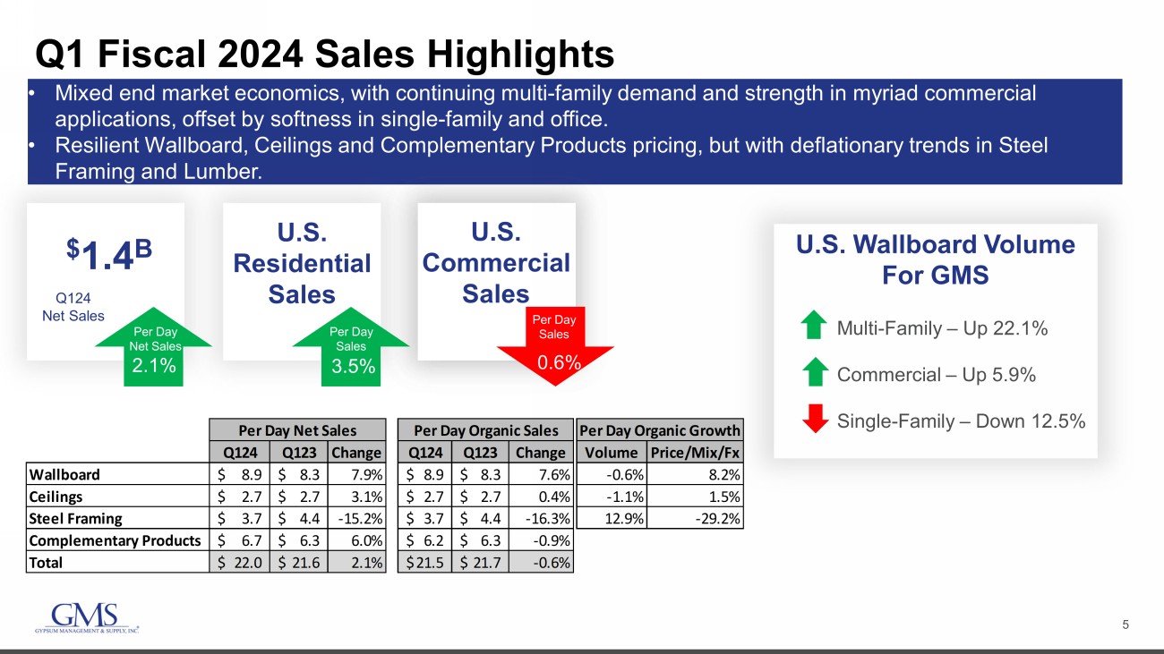4 Strategic Growth Priorities – Q1 Fiscal 2024 Update Capitalize on existing fixed investments in locations and equipment where we are underpenetrated or below expected share Grow Complementary Products opportunities outside of core products to diversify and profitably expand our offerings Expand the platform through accretive acquisition and greenfield opportunities Leverage our scale and employ technology and best practices to deliver a best - in - class customer experience and further profit improvement • Industry data indicates that we grew share in each of our core product categories • Value - added delivery to the point of use helped drive sales in tight labor market. • Favorable mix of multi - family projects has provided a solid backlog of Steel Framing, Wallboard and Insulation deliveries to that end market. • Benefits of scale and commitment to service resulted in securing a broad array of commercial projects across myriad markets. • 6.0% per day net sales growth on acquisition gains • 7.7% revenue gains excluding lumber. • 11.7% revenue growth on focus Tools & Fasteners, EIFS and Stucco, and Insulation product lines. • 13 th straight quarter of growth for Complementary • Expansion of Tool Source Warehouse operations. • Steady maturation of prior greenfields and acquisitions. • During the 1 st quarter we acquired Jawl Lumber Corporation d/b/a Home Lumber and Building Supplies in Canada. • Core and Complementary pipeline remains active. • Technology and process enabled improvements in myriad areas including warehouse operations, dispatch, delivery, purchasing, inventory management and pricing, • Enhancing our role as a valuable partner by providing customers with the ability to easily transact with us. • Organization - wide effort to reduce complexity cost and standardize data. Expand Share in Core Products Grow Complementary Products Expand Our Platform Drive Improved Productivity & Profitability As we’ve leveraged product inflation dynamics in the business, our productivity initiatives, along with growth in Complementa ry Products and expansion of scale, have enabled us to expand our Adjusted EBITDA margin from the upper single - digits in the years leading up to Covid to now consistently reporting these returns at double - digit levels for the past two fiscal years.
