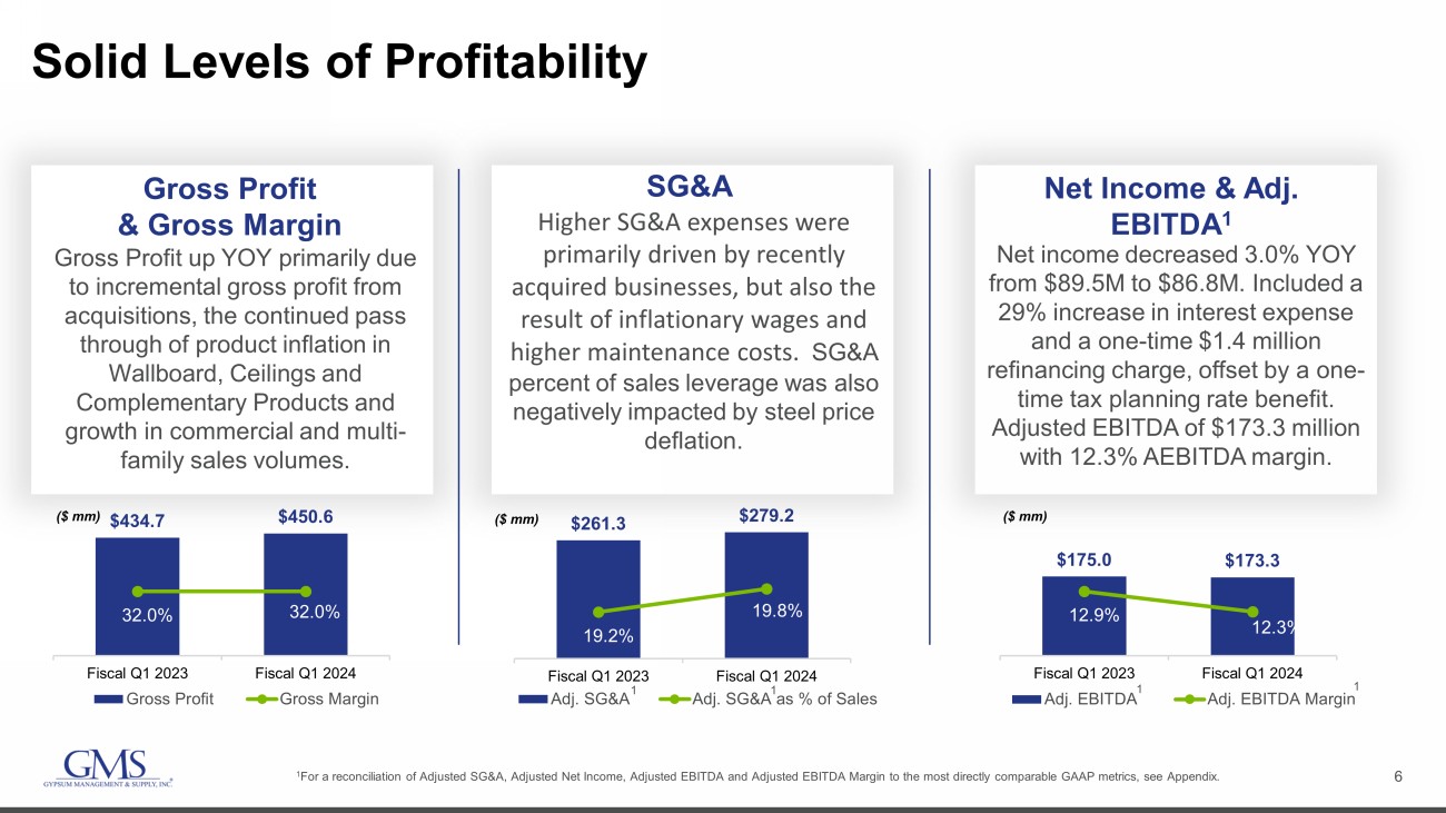 5 Q1 Fiscal 2024 Sales Highlights • Mixed end market economics, with continuing multi - family demand and strength in myriad commercial applications, offset by softness in single - family and office. • Resilient Wallboard, Ceilings and Complementary Products pricing, but with deflationary trends in Steel Framing and Lumber. U.S. Residential Sales Q124 Net Sales $ 1.4 B Per Day Net Sales 2.1% 3.5% U.S. Commercial Sales 0.6% U.S. Wallboard Volume For GMS Multi - Family – Up 22.1% Commercial – Up 5.9% Single - Family – Down 12.5% Per Day Sales Per Day Sales Q124 Q123 Change Q124 Q123 Change Volume Price/Mix/Fx Wallboard 8.9$ 8.3$ 7.9% 8.9$ 8.3$ 7.6% -0.6% 8.2% Ceilings 2.7$ 2.7$ 3.1% 2.7$ 2.7$ 0.4% -1.1% 1.5% Steel Framing 3.7$ 4.4$ -15.2% 3.7$ 4.4$ -16.3% 12.9% -29.2% Complementary Products 6.7$ 6.3$ 6.0% 6.2$ 6.3$ -0.9% Total 22.0$ 21.6$ 2.1% 21.5$ 21.7$ -0.6% Per Day Net Sales Per Day Organic Sales Per Day Organic Growth