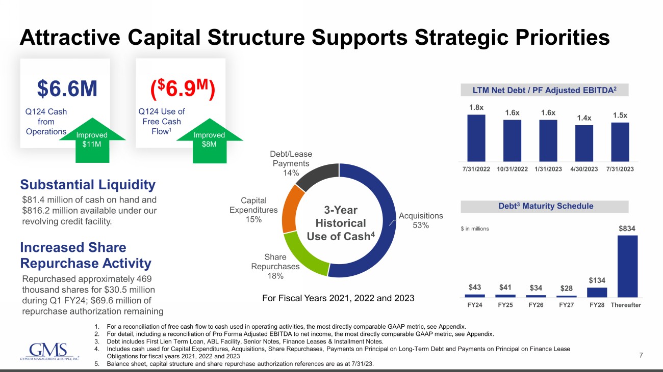 6 $434.7 $450.6 32.0% 32.0% 31.1% 31.6% 32.1% 32.6% $0 $50 $100 $150 $200 $250 $300 $350 $400 $450 $500 Fiscal Q1 2023 Fiscal Q1 2024 Gross Profit Gross Margin ($ mm) Solid Levels of Profitability 1 For a reconciliation of Adjusted SG&A, Adjusted Net Income, Adjusted EBITDA and Adjusted EBITDA Margin to the most directly c omp arable GAAP metrics, see Appendix. 1 1 1 $261.3 $279.2 19.2% 19.8% 18.0% 18.5% 19.0% 19.5% 20.0% 20.5% 21.0% 21.5% $0 $50 $100 $150 $200 $250 $300 Fiscal Q1 2023 Fiscal Q1 2024 Adj. SG&A Adj. SG&A as % of Sales ($ mm) 1 $175.0 $173.3 12.9% 12.3% 11.0% 11.5% 12.0% 12.5% 13.0% 13.5% 14.0% 14.5% 15.0% $0 $50 $100 $150 $200 $250 $300 Fiscal Q1 2023 Fiscal Q1 2024 Adj. EBITDA Adj. EBITDA Margin ($ mm) Gross Profit & Gross Margin Gross Profit up YOY primarily due to incremental gross profit from acquisitions, the continued pass through of product inflation in Wallboard, Ceilings and Complementary Products and growth in commercial and multi - family sales volumes. SG&A Higher SG&A expenses were primarily driven by recently acquired businesses, but also the result of inflationary wages and higher maintenance costs. SG&A percent of sales leverage was also negatively impacted by steel price deflation. Net Income & Adj. EBITDA 1 Net income decreased 3.0% YOY from $89.5M to $86.8M. Included a 29% increase in interest expense and a one - time $1.4 million refinancing charge, offset by a one - time tax planning rate benefit. Adjusted EBITDA of $173.3 million with 12.3% AEBITDA margin.