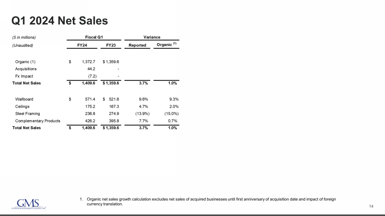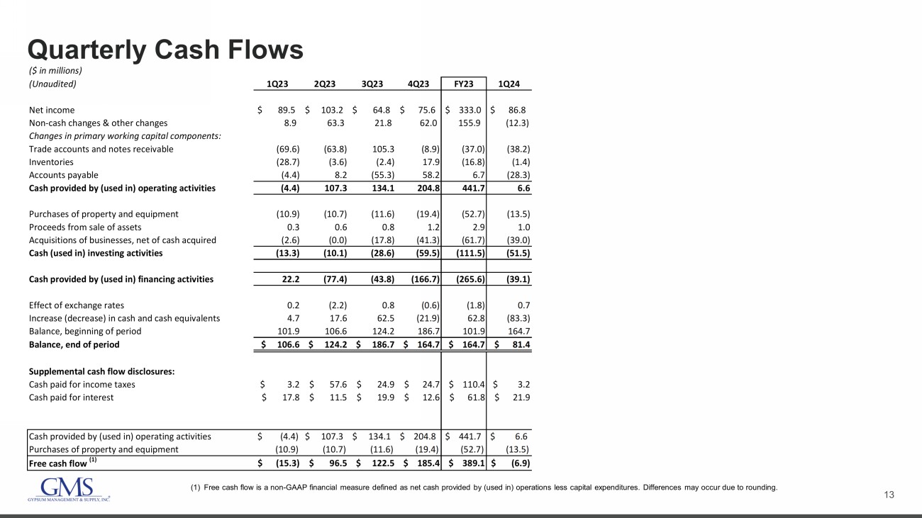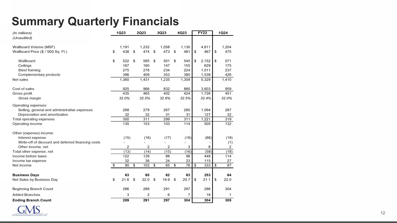 12 Summary Quarterly Financials (In millions) 1Q23 2Q23 3Q23 4Q23 FY23 1Q24 (Unaudited) Wallboard Volume (MSF) 1,191 1,232 1,058 1,130 4,611 1,204 Wallboard Price ($ / '000 Sq. Ft.) 438$ 474$ 473$ 481$ 467$ 475$ Wallboard 522$ 585$ 501$ 545$ 2,152$ 571$ Ceilings 167 160 147 155 629 175 Steel framing 275 278 234 224 1,011 237 Complementary products 396 409 353 380 1,538 426 Net sales 1,360 1,431 1,235 1,304 5,329 1,410 Cost of sales 925 966 832 880 3,603 959 Gross profit 435 465 402 424 1,726 451 Gross margin 32.0% 32.5% 32.6% 32.5% 32.4% 32.0% Operating expenses: Selling, general and administrative expenses 268 279 267 280 1,094 287 Depreciation and amortization 32 32 31 31 127 32 Total operating expenses 300 311 299 311 1,221 319 Operating income 135 153 103 114 505 132 Other (expense) income: Interest expense (15) (16) (17) (18) (66) (19) Write-off of discount and deferred financing costs - - - - - (1) Other income, net 2 2 2 3 8 2 Total other expense, net (13) (14) (15) (16) (58) (18) Income before taxes 122 139 88 98 448 114 Income tax expense 32 36 24 23 115 27 Net income 90$ 103$ 65$ 76$ 333$ 87$ Business Days 63 65 62 63 253 64 Net Sales by Business Day 21.6$ 22.0$ 19.9$ 20.7$ 21.1$ 22.0$ Beginning Branch Count 286 289 291 297 286 304 Added Branches 3 2 6 7 18 1 Ending Branch Count 289 291 297 304 304 305