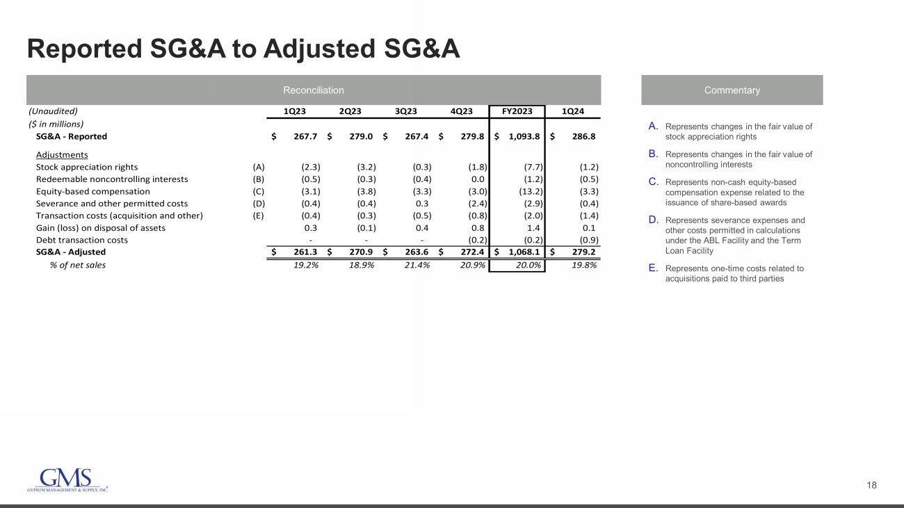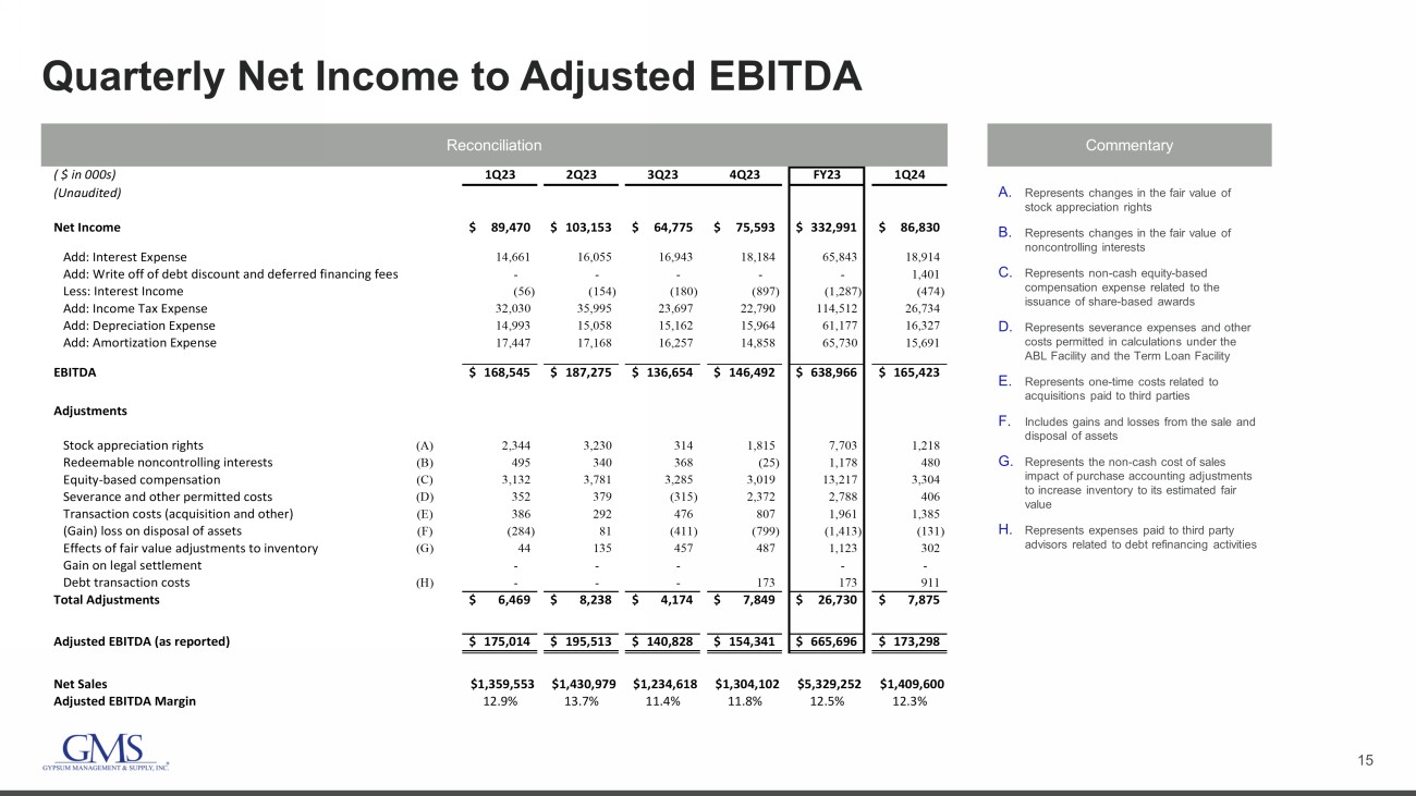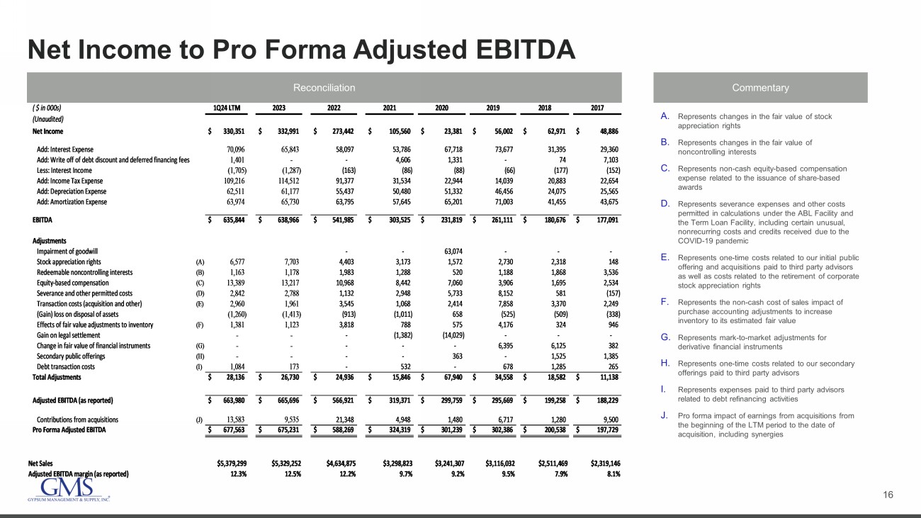 15 Quarterly Net Income to Adjusted EBITDA Reconciliation Commentary A. Represents changes in the fair value of stock appreciation rights B. Represents changes in the fair value of noncontrolling interests C. Represents non - cash equity - based compensation expense related to the issuance of share - based awards D. Represents severance expenses and other costs permitted in calculations under the ABL Facility and the Term Loan Facility E. Represents one - time costs related to acquisitions paid to third parties F. Includes gains and losses from the sale and disposal of assets G. Represents the non - cash cost of sales impact of purchase accounting adjustments to increase inventory to its estimated fair value H. Represents expenses paid to third party advisors related to debt refinancing activities ( $ in 000s) 1Q23 2Q23 3Q23 4Q23 FY23 1Q24 (Unaudited) Net Income 89,470$ 103,153$ 64,775$ 75,593$ 332,991$ 86,830$ Add: Interest Expense 14,661 16,055 16,943 18,184 65,843 18,914 Add: Write off of debt discount and deferred financing fees - - - - - 1,401 Less: Interest Income (56) (154) (180) (897) (1,287) (474) Add: Income Tax Expense 32,030 35,995 23,697 22,790 114,512 26,734 Add: Depreciation Expense 14,993 15,058 15,162 15,964 61,177 16,327 Add: Amortization Expense 17,447 17,168 16,257 14,858 65,730 15,691 EBITDA 168,545$ 187,275$ 136,654$ 146,492$ 638,966$ 165,423$ Adjustments Stock appreciation rights (A) 2,344 3,230 314 1,815 7,703 1,218 Redeemable noncontrolling interests (B) 495 340 368 (25) 1,178 480 Equity-based compensation (C) 3,132 3,781 3,285 3,019 13,217 3,304 Severance and other permitted costs (D) 352 379 (315) 2,372 2,788 406 Transaction costs (acquisition and other) (E) 386 292 476 807 1,961 1,385 (Gain) loss on disposal of assets (F) (284) 81 (411) (799) (1,413) (131) Effects of fair value adjustments to inventory (G) 44 135 457 487 1,123 302 Gain on legal settlement - - - - - Debt transaction costs (H) - - - 173 173 911 Total Adjustments 6,469$ 8,238$ 4,174$ 7,849$ 26,730$ 7,875$ Adjusted EBITDA (as reported) 175,014$ 195,513$ 140,828$ 154,341$ 665,696$ 173,298$ Net Sales $1,359,553 $1,430,979 $1,234,618 $1,304,102 $5,329,252 $1,409,600 Adjusted EBITDA Margin 12.9% 13.7% 11.4% 11.8% 12.5% 12.3%