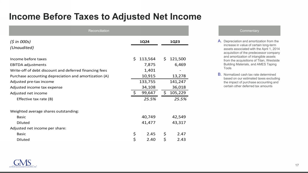 16 Net Income to Pro Forma Adjusted EBITDA Reconciliation Commentary A. Represents changes in the fair value of stock appreciation rights B. Represents changes in the fair value of noncontrolling interests C. Represents non - cash equity - based compensation expense related to the issuance of share - based awards D. Represents severance expenses and other costs permitted in calculations under the ABL Facility and the Term Loan Facility, including certain unusual, nonrecurring costs and credits received due to the COVID - 19 pandemic E. Represents one - time costs related to our initial public offering and acquisitions paid to third party advisors as well as costs related to the retirement of corporate stock appreciation rights F. Represents the non - cash cost of sales impact of purchase accounting adjustments to increase inventory to its estimated fair value G. Represents mark - to - market adjustments for derivative financial instruments H. Represents one - time costs related to our secondary offerings paid to third party advisors I. Represents expenses paid to third party advisors related to debt refinancing activities J. Pro forma impact of earnings from acquisitions from the beginning of the LTM period to the date of acquisition, including synergies ( $ in 000s) 1Q24 LTM 2023 2022 2021 2020 2019 2018 2017 (Unaudited) Net Income 330,351$ 332,991$ 273,442$ 105,560$ 23,381$ 56,002$ 62,971$ 48,886$ Add: Interest Expense 70,096 65,843 58,097 53,786 67,718 73,677 31,395 29,360 Add: Write off of debt discount and deferred financing fees 1,401 - - 4,606 1,331 - 74 7,103 Less: Interest Income (1,705) (1,287) (163) (86) (88) (66) (177) (152) Add: Income Tax Expense 109,216 114,512 91,377 31,534 22,944 14,039 20,883 22,654 Add: Depreciation Expense 62,511 61,177 55,437 50,480 51,332 46,456 24,075 25,565 Add: Amortization Expense 63,974 65,730 63,795 57,645 65,201 71,003 41,455 43,675 EBITDA 635,844$ 638,966$ 541,985$ 303,525$ 231,819$ 261,111$ 180,676$ 177,091$ Adjustments Impairment of goodwill - - 63,074 - - - Stock appreciation rights (A) 6,577 7,703 4,403 3,173 1,572 2,730 2,318 148 Redeemable noncontrolling interests (B) 1,163 1,178 1,983 1,288 520 1,188 1,868 3,536 Equity-based compensation (C) 13,389 13,217 10,968 8,442 7,060 3,906 1,695 2,534 Severance and other permitted costs (D) 2,842 2,788 1,132 2,948 5,733 8,152 581 (157) Transaction costs (acquisition and other) (E) 2,960 1,961 3,545 1,068 2,414 7,858 3,370 2,249 (Gain) loss on disposal of assets (1,260) (1,413) (913) (1,011) 658 (525) (509) (338) Effects of fair value adjustments to inventory (F) 1,381 1,123 3,818 788 575 4,176 324 946 Gain on legal settlement - - - (1,382) (14,029) - - - Change in fair value of financial instruments (G) - - - - - 6,395 6,125 382 Secondary public offerings (H) - - - - 363 - 1,525 1,385 Debt transaction costs (I) 1,084 173 - 532 - 678 1,285 265 Total Adjustments 28,136$ 26,730$ 24,936$ 15,846$ 67,940$ 34,558$ 18,582$ 11,138$ Adjusted EBITDA (as reported) 663,980$ 665,696$ 566,921$ 319,371$ 299,759$ 295,669$ 199,258$ 188,229$ Contributions from acquisitions (J) 13,583 9,535 21,348 4,948 1,480 6,717 1,280 9,500 Pro Forma Adjusted EBITDA 677,563$ 675,231$ 588,269$ 324,319$ 301,239$ 302,386$ 200,538$ 197,729$ Net Sales $5,379,299 $5,329,252 $4,634,875 $3,298,823 $3,241,307 $3,116,032 $2,511,469 $2,319,146 Adjusted EBITDA margin (as reported) 12.3% 12.5% 12.2% 9.7% 9.2% 9.5% 7.9% 8.1%