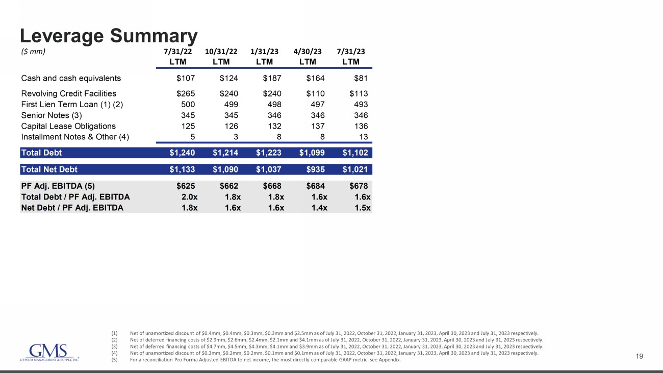 18 Reported SG&A to Adjusted SG&A Reconciliation Commentary A. Represents changes in the fair value of stock appreciation rights B. Represents changes in the fair value of noncontrolling interests C. Represents non - cash equity - based compensation expense related to the issuance of share - based awards D. Represents severance expenses and other costs permitted in calculations under the ABL Facility and the Term Loan Facility E. Represents one - time costs related to acquisitions paid to third parties (Unaudited) 1Q23 2Q23 3Q23 4Q23 FY2023 1Q24 ($ in millions) SG&A - Reported 267.7$ 279.0$ 267.4$ 279.8$ 1,093.8$ 286.8$ Adjustments Stock appreciation rights (A) (2.3) (3.2) (0.3) (1.8) (7.7) (1.2) Redeemable noncontrolling interests (B) (0.5) (0.3) (0.4) 0.0 (1.2) (0.5) Equity-based compensation (C) (3.1) (3.8) (3.3) (3.0) (13.2) (3.3) Severance and other permitted costs (D) (0.4) (0.4) 0.3 (2.4) (2.9) (0.4) Transaction costs (acquisition and other) (E) (0.4) (0.3) (0.5) (0.8) (2.0) (1.4) Gain (loss) on disposal of assets 0.3 (0.1) 0.4 0.8 1.4 0.1 Debt transaction costs - - - (0.2) (0.2) (0.9) SG&A - Adjusted 261.3$ 270.9$ 263.6$ 272.4$ 1,068.1$ 279.2$ % of net sales 19.2% 18.9% 21.4% 20.9% 20.0% 19.8%