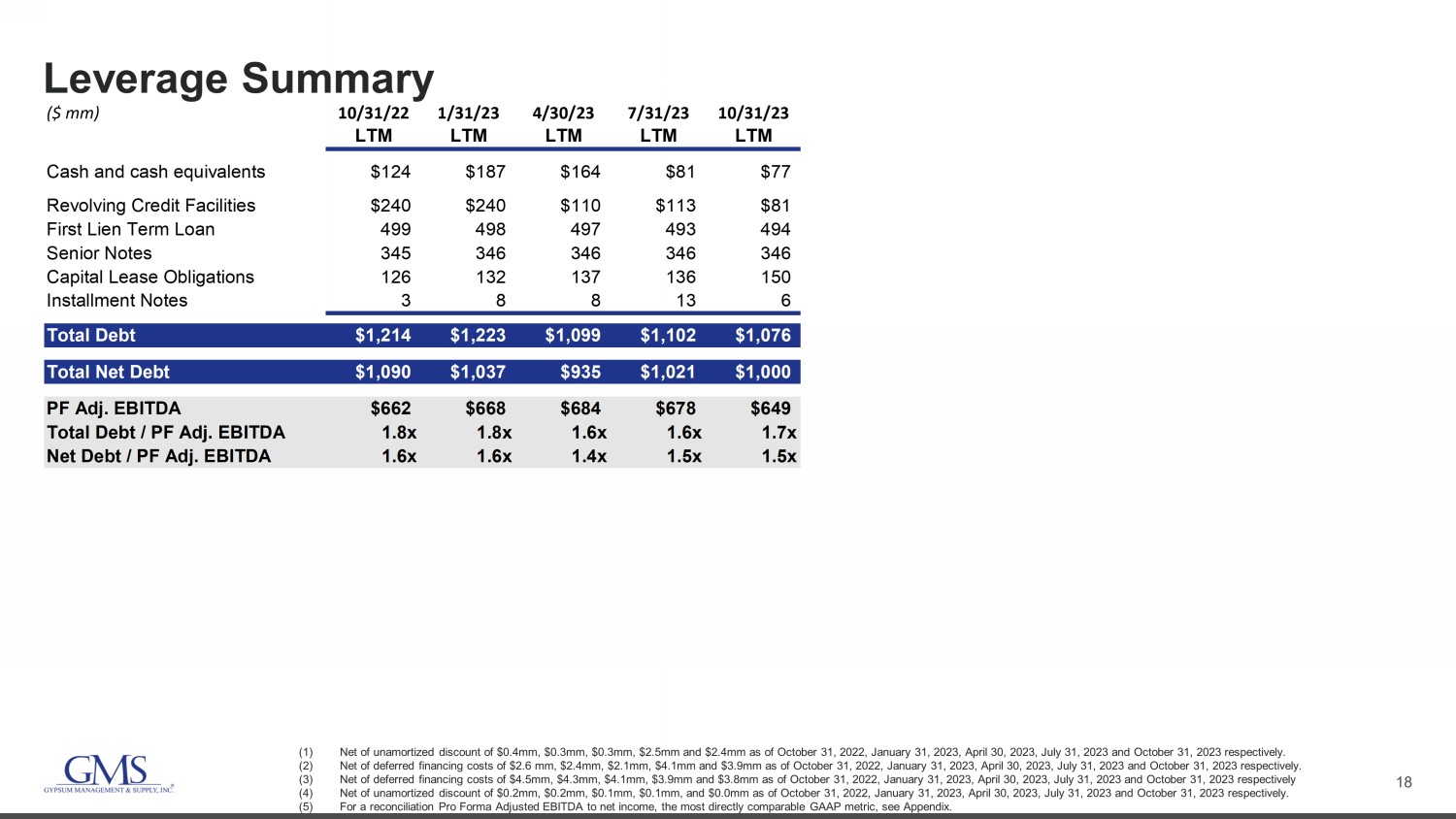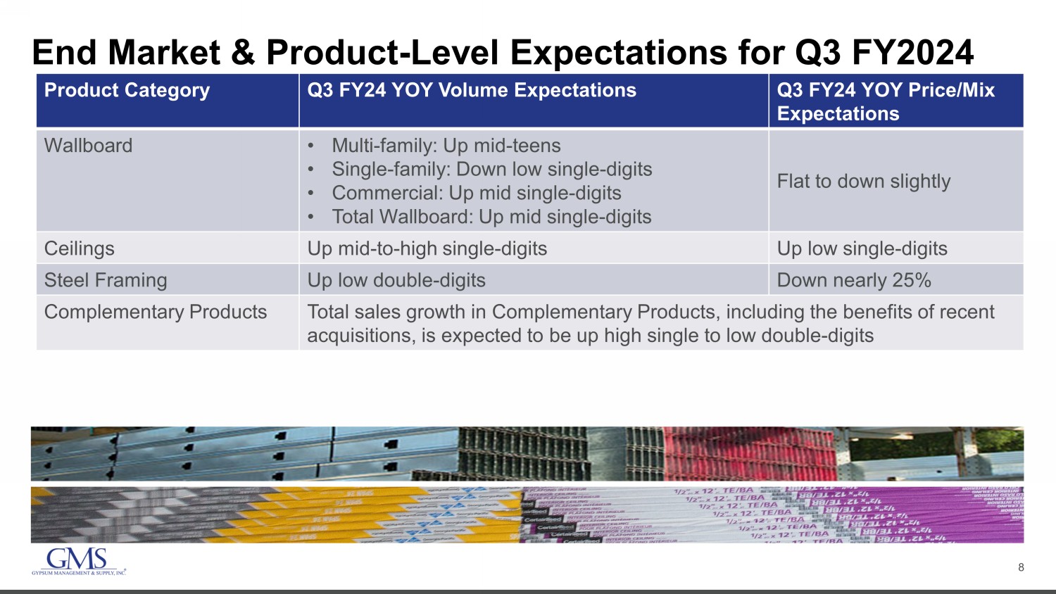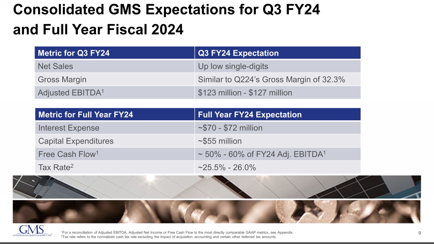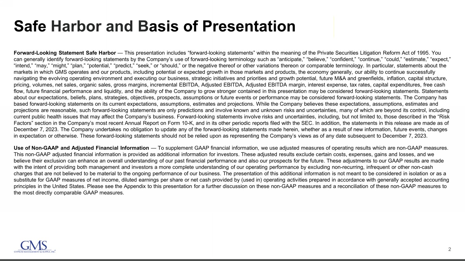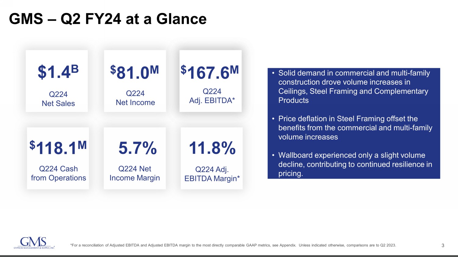 2 Safe Harbor and B asis of Presentation Forward - Looking Statement Safe Harbor — This presentation includes “forward - looking statements” within the meaning of the Private Securities Litigation Reform Act of 1995. You can generally identify forward - looking statements by the Company’s use of forward - looking terminology such as “anticipate,” “bel ieve,” “confident,” “continue,” “could,” “estimate,” “expect,” “intend,” “may,” “might,” “plan,” “potential,” “predict,” “seek,” or “should,” or the negative thereof or other variations th ere on or comparable terminology. In particular, statements about the markets in which GMS operates and our products, including potential or expected growth in those markets and products, the eco nom y generally, our ability to continue successfully navigating the evolving operating environment and executing our business, strategic initiatives and priorities and growth pot ent ial, future M&A and greenfields, inflation, capital structure, pricing, volumes, net sales, organic sales, gross margins, incremental EBITDA, Adjusted EBITDA, Adjusted EBITDA margin, inter est expense, tax rates, capital expenditures, free cash flow, future financial performance and liquidity, and the ability of the Company to grow stronger contained in this presentat ion may be considered forward - looking statements. Statements about our expectations, beliefs, plans, strategies, objectives, prospects, assumptions or future events or performance may be co nsidered forward - looking statements. The Company has based forward - looking statements on its current expectations, assumptions, estimates and projections. While the Company believes these expectations, assumptions, estimates and projections are reasonable, such forward - looking statements are only predictions and involve known and unknown risks and uncerta inties, many of which are beyond its control, including current public health issues that may affect the Company’s business. Forward - looking statements involve risks and uncertainties, including, but not limited to, those described in the “Risk Factors” section in the Company’s most recent Annual Report on Form 10 - K, and in its other periodic reports filed with the SEC. In addition, the statements in this release are made as of December 7, 2023. The Company undertakes no obligation to update any of the forward - looking statements made herein, whether as a result of new information, future events, changes in expectation or otherwise. These forward - looking statements should not be relied upon as representing the Company’s views as o f any date subsequent to December 7, 2023. Use of Non - GAAP and Adjusted Financial Information — To supplement GAAP financial information, we use adjusted measures of operating results which are non - GAAP measures. This non - GAAP adjusted financial information is provided as additional information for investors. These adjusted results exclude certain costs, expenses, gains and losses, and we believe their exclusion can enhance an overall understanding of our past financial performance and also our prospects for the fu ture. These adjustments to our GAAP results are made with the intent of providing both management and investors a more complete understanding of our operating performance by excl udi ng non - recurring, infrequent or other non - cash charges that are not believed to be material to the ongoing performance of our business. The presentation of this additional inf ormation is not meant to be considered in isolation or as a substitute for GAAP measures of net income, diluted earnings per share or net cash provided by (used in) operating activities pr epared in accordance with generally accepted accounting principles in the United States. Please see the Appendix to this presentation for a further discussion on these non - GAAP measure s and a reconciliation of these non - GAAP measures to the most directly comparable GAAP measures.