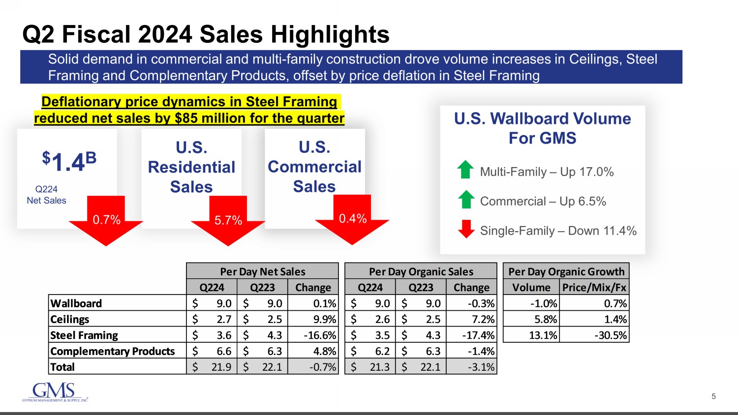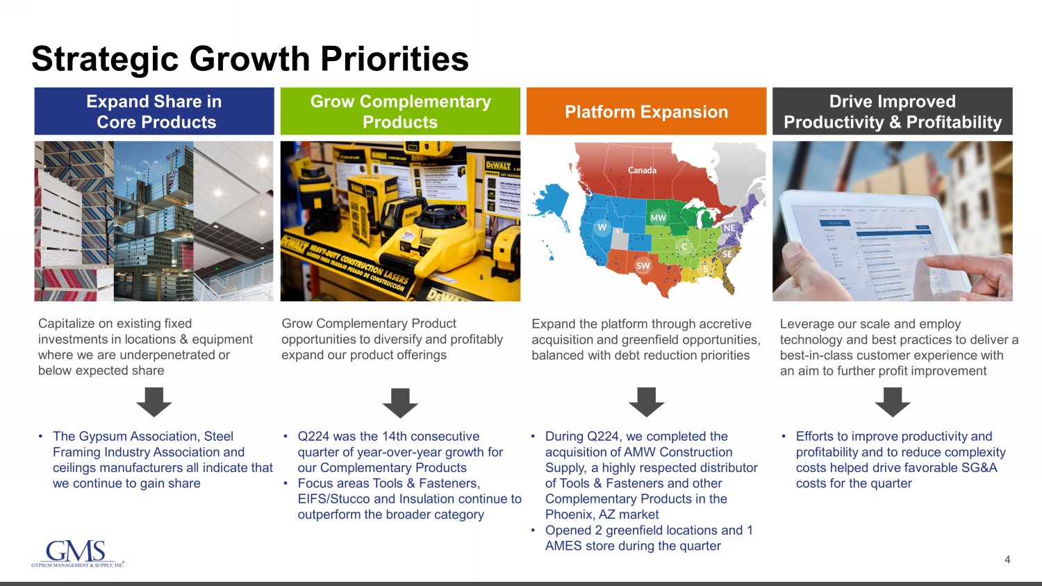 3 Q224 Net Income $ 81.0 M Q224 Cash from Operations GMS – Q2 FY24 at a Glance Q224 Net Income Margin *For a reconciliation of Adjusted EBITDA and Adjusted EBITDA margin to the most directly comparable GAAP metrics, see Appendi x. Unless indicated otherwise, comparisons are to Q2 2023. Q224 Adj. EBITDA* $ 167.6 M Q224 Net Sales $1.4 B $ 118.1 M 11.8% Q224 Adj. EBITDA Margin* • Solid demand in commercial and multi - family construction drove volume increases in Ceilings, Steel Framing and Complementary Products • Price deflation in Steel Framing offset the benefits from the commercial and multi - family volume increases • Wallboard experienced only a slight volume decline, contributing to continued resilience in pricing. 5.7%